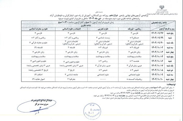 در خصوص برگزاری مراسم معنوی اعتکاف در دی ماه سال جاری، شایسته است به گونه ای برنامه ریزی نمایند که در ایام مذکور ضمن دایر بودن کلاس ها آزمونی برگزار نشود و آزمونها پس از ایام اعتکاف ادامه یابند.