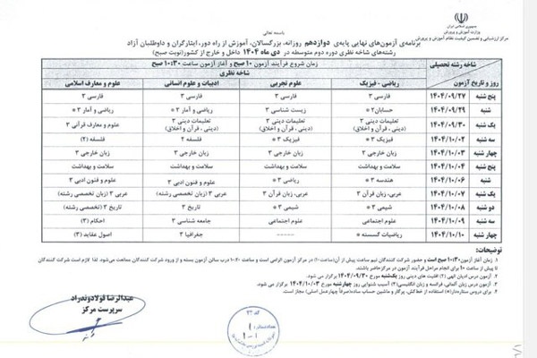 برنامه آزمون نهایی پایه دوازدهم روزانه بزرگسال آموزش از راه دور ایثارگران و داوطلب آزاد رشته های شاخه نظری دوره دوم آموزش متوسطه در نوبت دی ماه سال تحصیلی ۱۴۰۵-۱۴۰۴ از سوی مرکز ارزشیابی و تضمین کیفیت نظام آموزش و پرورش از فردا ساعت ۱۰:۳۰ صبح برگزار و تا ۱۰ دی ماه با برگزاری ۱۱ درس ادامه دارد.