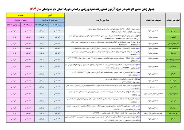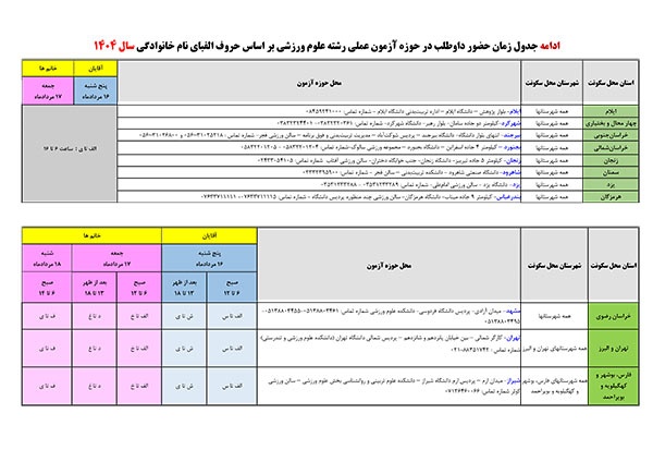 4- آزمون عملي رشته علوم ورزشي بر اساس استان محل اقامت و زمان اعلام شده در جدول ذیل برگزار ميشود. كارت شركت در آزمون عملي در حوزه هاي برگزاري آزمون تحويل متقاضیان خواهد شد.