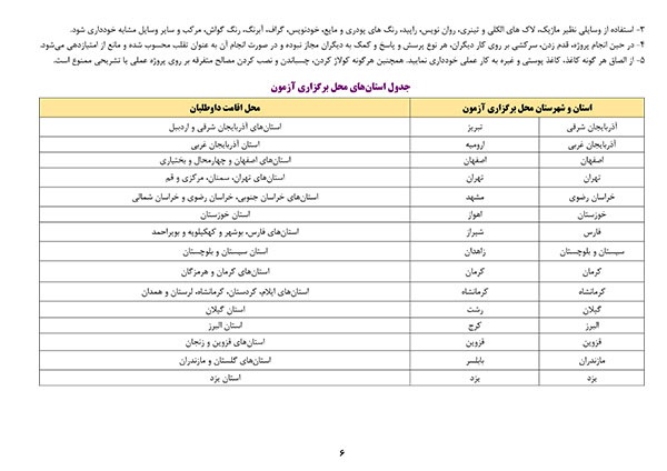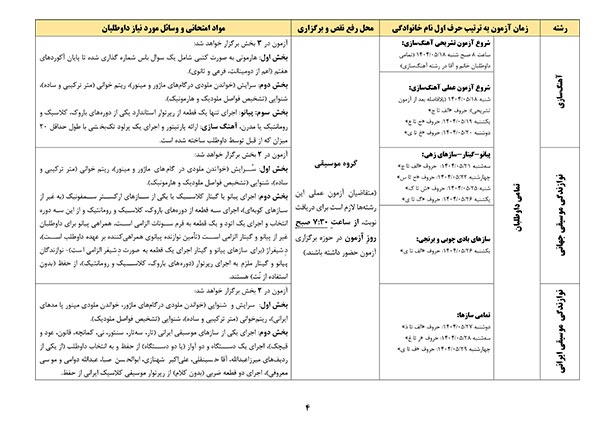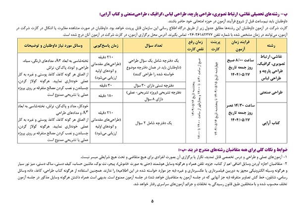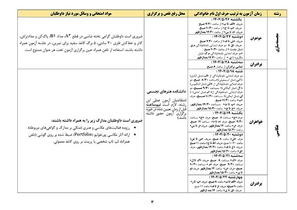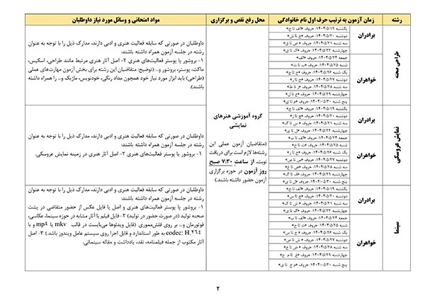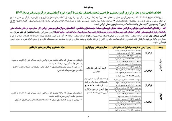متن اطلاعیه وجدول زمانبندی حضور داوطلب درحوزه برگزاری آزمون عملی رشته های هنر به شرح زیر می باشد: