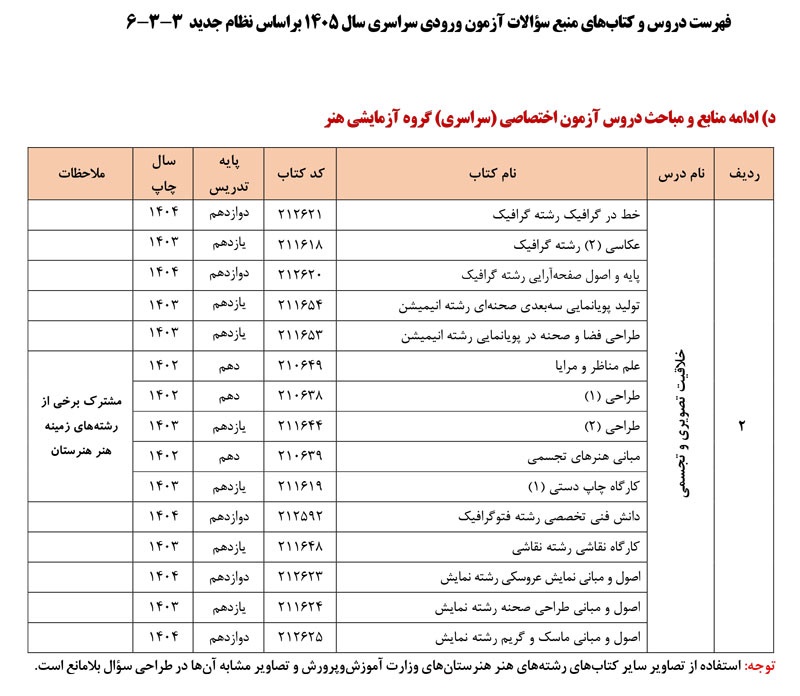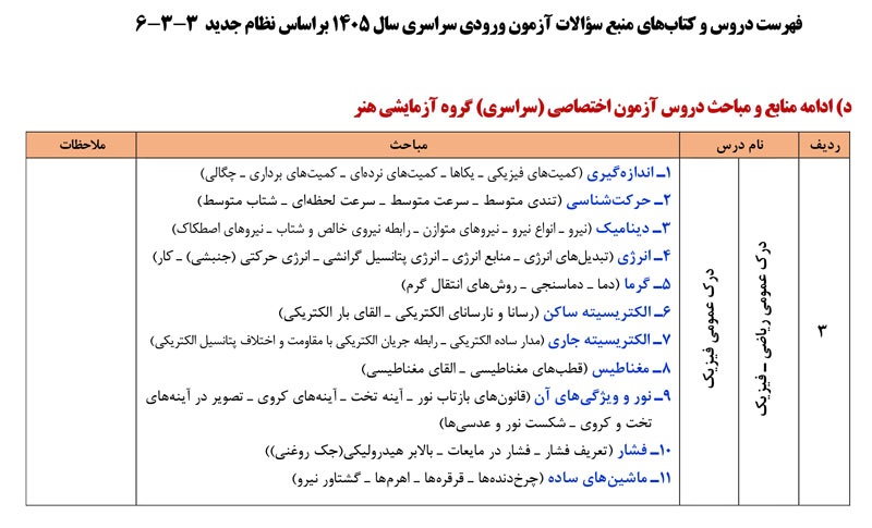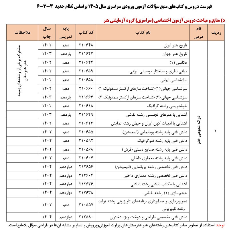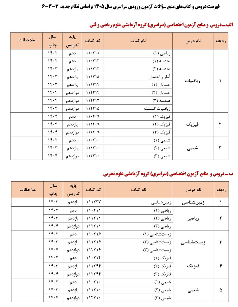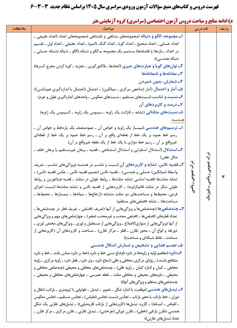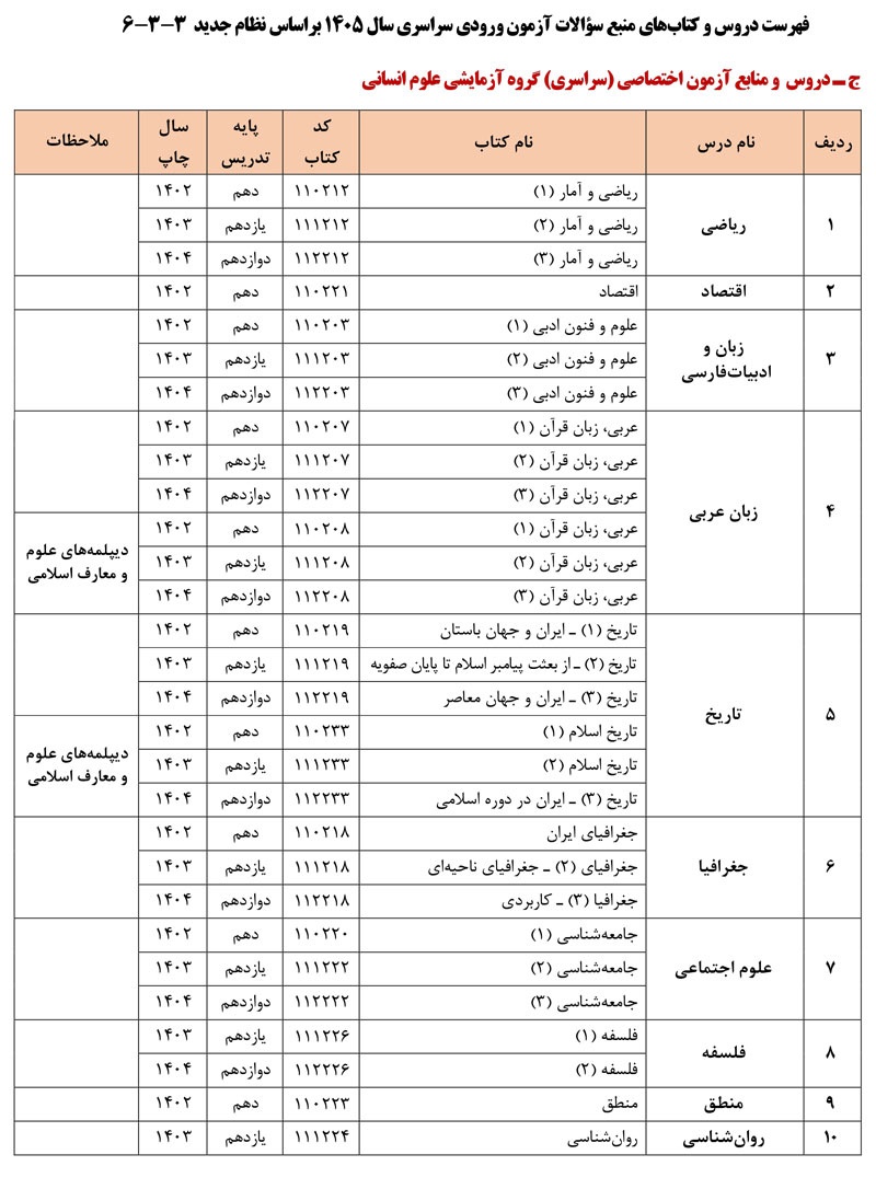 فهرست دروس و کتابهای منبع سؤالات آزمون ورودی سراسری سال ۱۴۰۵ به شرح زیر می باشد: