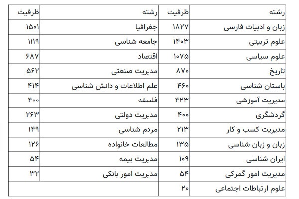 در گروه «علوم انسانی و علوم اجتماعی» بیشترین ظرفیت متعلق به رشته زبان و ادبیات فارسی و کمترین ظرفیت متعلق به رشته علوم ارتباطات اجتماعی است.