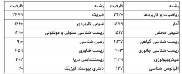 ظرفیت درج شده در دفترچه کنکور ۱۴۰۴ برای رشتههای اولویت دار گروه علوم پایه