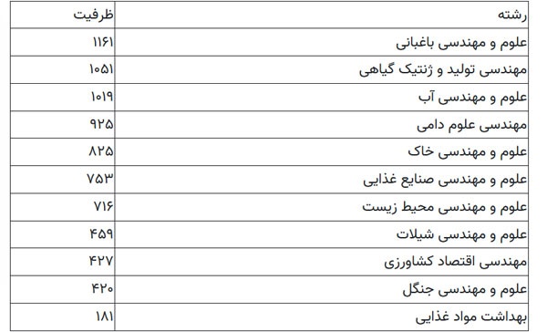 در این بخش بیشترین ظرفیت به علوم و مهندسی باغبانی و کمترین ظرفیت به بهداشت مواد غذایی اختصاص دارد.