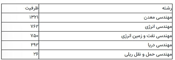 در بخش فنی مهندسی تعداد رشتههایی که در اولویت قرار گرفته اند به پنج رشته محدود شده اند. رشتههای گروه «فنی و مهندسی» شامل رشتههای مهندسی انرژی، مهندسی حمل و نقل ریلی، مهندسی دریا، مهندسی معدن، مهندسی نفت و زمین انرژی است. ظرفیتی که برای این پنج رشته تعیین شده است ۳ هزار و ۱۵۱ نفر است که بیشترین آن به مهندسی معدن و کمترین آن به مهندسی حمل و نقل ریلی تعلق دارد.