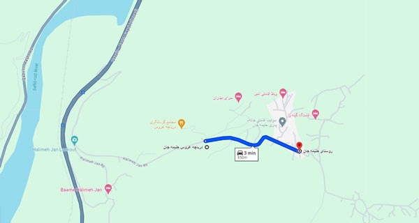 روستای حلیمه جان هم مسیر متفاوتی با دریاچه عروس حلیمه جان ندارد و تنها تفاوت آن فاصله 850 متری دریاچه از روستاست. شما اگر از آزادراه قزوینرشت به سمت جاده حلیمه جان بروید، ابتدا به دریاچه عروس حلیمه جان میرسید و سپس بعد از سه دقیقه رانندگی به روستای حلیمه جان خواهید رسید. از دریاچه تا روستا با پای پیاده، حدود 10 دقیقه طول خواهد کشید.