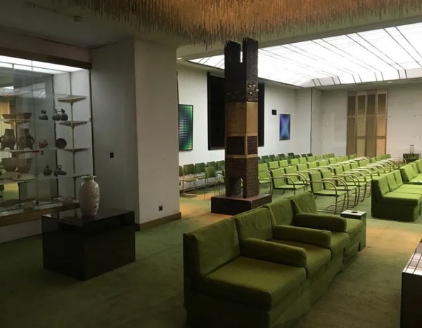 "مشهورترین قالی ایرانی در کاخ نیاوران در معرض دید عموم قرار دارد"کلیه ظروف تزیینی در این سالن ارزش تاریخی دارند و در میان آنها سفالینههای باستانشناسی مارلیک و املش خودنمایی میکنند. بسیاری از ظروف و اشیای گرانبها در این سالن، هدیه دولتهای خارجی به دولت ایران بودهاند که در میان آنها ظرف زیبایی از نقره دیده میشود که هدیه کشور رومانی به پادشاه ایران بوده است.