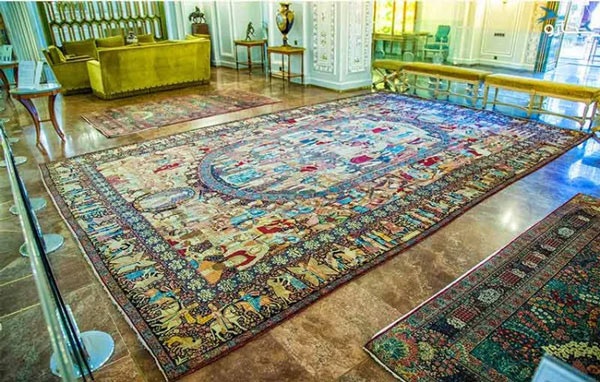 مشهورترین قالی ایرانی در این اتاق پذیرایی (با طراحی ۱۰۹ تن از پادشاهان ایران، ۵۶ تن از مشاهیر جهان و ۱۶ تصویر از حجاریهای مربوط به دوره ساسانی و هخامنشی) قرار دارد. این اثر ارزشمند، هنر دست هنرمند ایرانی، استاد علی کرمانی است. در طرح بیضی وسط فرش نقش پادشاهان و در حاشیه آن نقش و نگارهایی از ایران باستان دیده میشود. مساحت این فرش ۱۸ متر مربع است و در تاریخ ۱۲۹۹ خورشیدی توسط حسن خان شاهرخی، طراحی و به دست استاد علی کرمانی بافته شده است. حاشیه این فرش اقتباس از کتاب «عجم» تالیف فرصتالدوله شیرازی است و همچنین در متن فرش هم نمونههایی از این کتاب سود برده و نام افراد هم در کنار آن قید شده است. در قسمت تحتانی متن فرش هم عکسی از شاه قاجار احمد شاه نقش بسته است.
