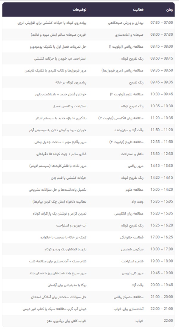 - فعالیتهای غیر درسی مثل خواب (۸ ساعت) و غذا به طور متعادل لحاظ شدهاند.