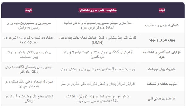 - تقویت اینسولا: ناحیهای که با خودآگاهی و درک حالات درونی بدن مرتبط است.