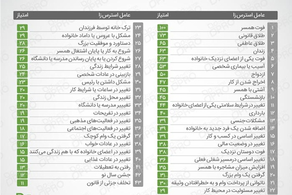 مقیاس استرس (جدول میزان استرس)به فهرست و جدول میزان استرس زیر نگاه کنید. این فهرست مربوط به اتفاقات یک سال اخیر زندگی شماست. برای اندازهگیری میزان استرستان، امتیازهای هریک از این اتفاقات را که در سال اخیر برای شما رخ داده است با یکدیگر جمع کنید.