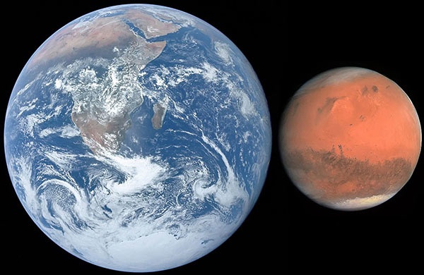 قطر مریخ برابر با نیمی از قطر زمین و مساحت سطح آن هم اندکی از مساحت خشکیهای زمین کمتر است. مریخ چگالی کمتری نسبت به زمین دارد. حجم آن ۱۵ درصد حجم زمین و جرم آن تقریباً ۱۱ درصد جرم زمین است؛ درنتیجه گرانش مریخ، ۳۸ درصد از گرانش زمین است. بنابراین شخصی با وزن ۱۰۰ کیلوگرم روی زمین در مریخ ۶۲ کیلوگرم خوهد بود اما جرم او در زمین و مریخ یکسان است.