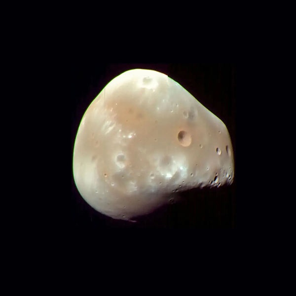 تصویر بهبودیافته رنگی از دیموس که HiRISE ثبت کرده است. این تصویر پوشش نرم و هموار رگولیتی دیموس را نشان میدهد.