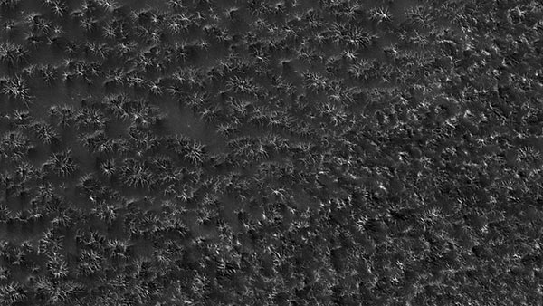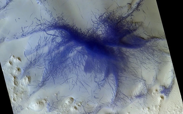 تصویر دریافتی مدارپیمای آژانس فضایی اروپا (ESA) در سال ۲۰۱۹ مانند عنکبوتی عظیم با موهای آبی بهنظر میرسد که پاهایش را روی کوهستانی مریخی قرار داده است. واقعیت بسیار جالبتر است. پاهای این عنکبوت درواقع مسیرهای صدها گردباد کوچک یا تنوره دیو هستند. هنوز مشخص نیست چرا این کوه محل تمرکز گردبادها است؛ اما بهگفته دانشمندان ESA، حرکت تودههای هوا در این منطقه میتواند به تشکیل چنین گردبادهای بینجامد.