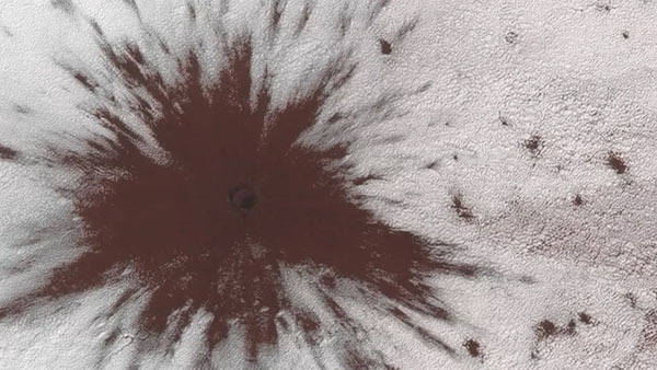 بین جولای و سپتامبر ۲۰۱۹، جسمی فضایی که احتمالاً شهابسنگ یا بخشی از دنبالهدار بود، با پوشش یخی جنوبی مریخ برخورد کرد و با سوراخ کردن لایهای نازک از پوشش یخی، باعث انتشار خاک سرخ از گودالی شد. نتیجه این اتفاق به وجود آمدن ترشحی سرخ و بزرگ بود که به برخورد شخصیتهای کارتونی به دیوار شباهت داشت. دوربین بزرگ HiRISE (ابزار علمی تصویربرداری با وضوح چشمگیر) روی مدارپیمای اکتشافی مریخ (MRO) این ترشح را ثبت کرد که عرض آن به یک کیلومتر میرسد. این ترشح خطای دید نبود و کاملاً ثابت شد.