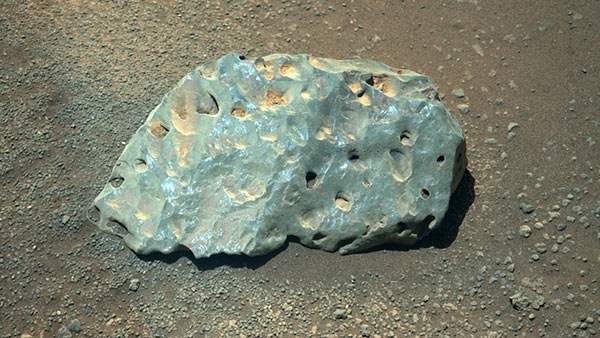همانطور که میدانید، مریخ سیارهای سرخ است؛ اما این سنگ سبز عجیب (تصویر ذیل) روی سیاره سرخ چه میکند؟ کاوشگر پرسویرنس تصویر این سنگ را ثبت کرده است. طول این سنگ تقریباً به پانزده سانتیمتر میرسد و در دهانه برخوردی یزرو قرار دارد که نزدیک به محل فرود پرسویرنس است. مریخنورد پرسویرنس بخشی از سنگ را جدا کرد تا آن را تبخیر کند. دوربینها و طیفسنجهای مریخنورد ابر بخاری حاصل را بررسی کردند تا از ترکیب شیمیایی آن رونمایی کنند. بهزودی پاسخ این راز معلوم خواهد شد.