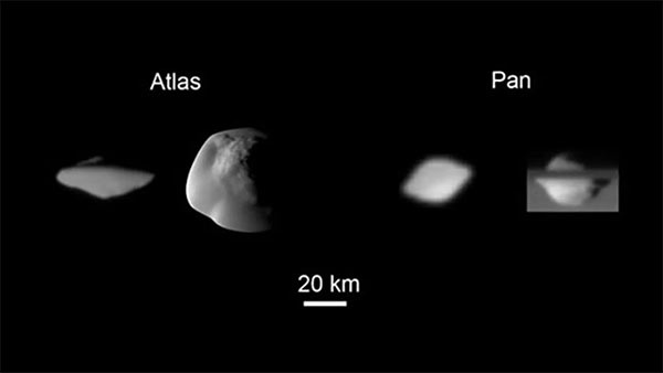 پان و اطلس هر دو از داخلیترین قمرهای زحل هستند. اطلس در لبهی خارجی حلقهی A به دور زحل میچرخد. تقریباً ۱۴/۴ ساعت طول میکشد تا اطلس مدار زحل را کامل کند این مدت برای پان ۱۳/۸ ساعت است. پان و اطلس قمرهای زحل کوچکترین قمرهای منظومه شمسی هستند. این قمرها با وجود اندازه کوچک میتوانند بر منظومه حلقه زحل تأثیر بگذارند. این دنیاهای کوچک را شاید بتوان بهترین نمونههای شناختهشده از قمرهای چوپان برشمرد. قمرهای چوپان قمروارههای کوچکی هستند که در منظومههای حلقهای سیارههای غولآسا قرار دارند. همانطورکه از نامشان پیدا است، این قمرها به ذرات موجود در سیستم زحل کمک میکنند کنار یکدیگر قرار بگیرند و درعینحال، ذرات دیگر را پاکسازی میکنند