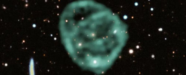 حباب سبز رنگ و تار در فضا با زمینهای از ستارگان، این تصویر اولین «حباب رادیویی عجیب» است که تاکنون کشف شده