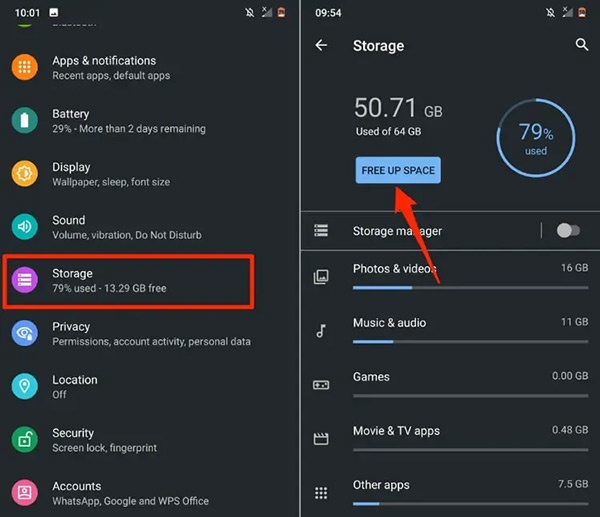 برخی از گوشیهای اندرویدی قابلیتی بهنام Free up space دارند که با فعالسازی آن میتوانید فایلهای غیرضروری، فایلهای لاگ و فایلهای قدیمی بدوناستفاده را حذف کنید.