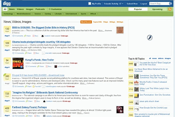 همزمان، پلتفرمهای دیگری نیز نوآوریهای خود را در عرصهی محتوای کاربرمحور ارائه میدادند. سال ۲۰۰۴، Digg بهعنوان وبسایتی برای بهاشتراکگذاری و رأیدهی به اخبار و محتوا راهاندازی شد.