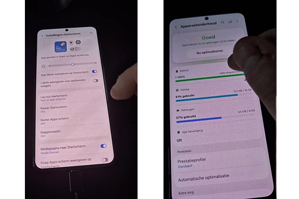 بخش مدیریت دستگاه تغییر چشمگیری داشته است. نمودارهای نمایش رم، فضای ذخیرهسازی و باتری حالا پهنتر شدهاند و اعداد درصدی را نمایش میدهند. همچنین اموجی نمایش وضعیت دستگاه که در One UI 8.0 دیده میشد، در One UI 8.5 با متن جایگزین شده است.