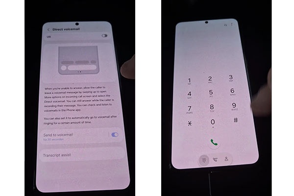 اپلیکیشن Dialer تغییر ظاهری بزرگی به خود دیده است. تبهای شمارهگیر، تاریخچهی تماس و مخاطبین بهصورت داک کپسولیشکل در پایین صفحه قرار گرفتهاند. دکمهی تماس نیز حالا سایهدار شده است. افزونبر این، ویژگی جدیدی به نام Direct Voicemail اضافه شده که مشابه Live Voicemail در iOS 18 است و قابلیت نمایش متن تماسهای صوتی بهصورت زنده را ارائه میدهد.