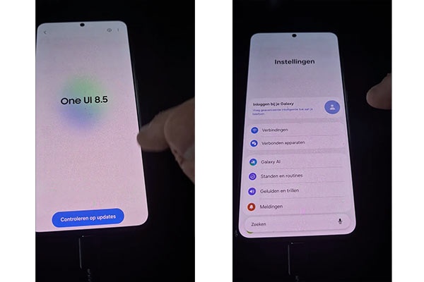 برندینگ One UI 8.5 در صفحهی بهروزرسانی نرمافزاری دیده میشود. همچنین طراحی این بخش تغییر کرده است و نسخهی فعلی رابط کاربری در ابتدا نمایش داده میشود و گزینهی «بررسی برای بهروزرسانی» به پایین صفحه منتقل شده است.