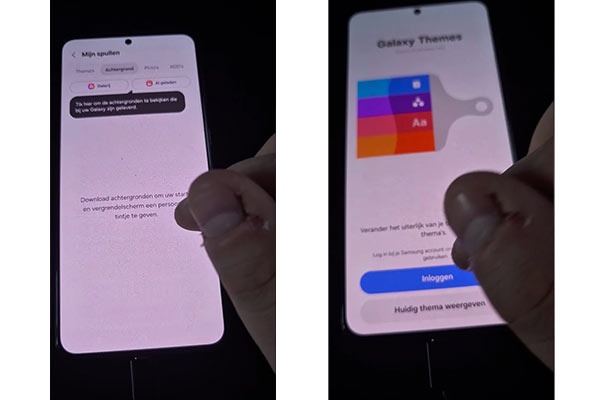 اپلیکیشن گلکسی استور با صفحهی اصلی جدیدی باز میشود که تصویر قلمموی بزرگ در آن دیده میشود. رابط کاربری این بخش به دو قسمت اصلی (Gallery و My Stuff) و چهار تب (Themes، Backgrounds ،Wallpapers و AODs) تقسیم شده است.