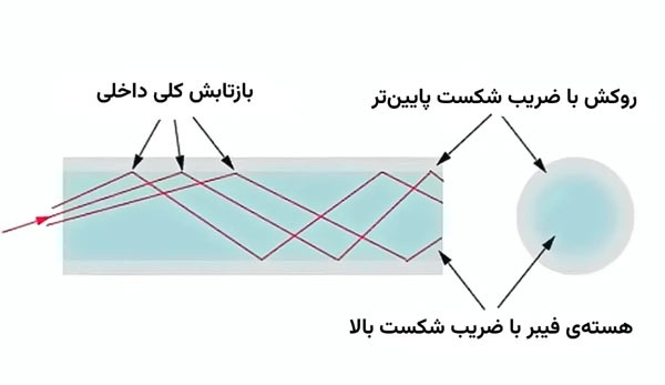 "هستهی شیشهای فیبر تنها ۹ میکرون قطر دارد، اما میلیاردها بار نور را بازمیتاباند"نوری که به درون هسته فرستاده میشود، با زاویهای حسابشده به دیوارهی مرزی بین هسته و روکش برخورد میکند که همواره از زاویهی بحرانی بیشتر است. در نتیجه، نور بهجای فرارکردن، به طور مداوم و با کمترین اتلاف انرژی به درون هسته بازتابیده میشود و مسیر خود را در طول کابل ادامه میدهد.