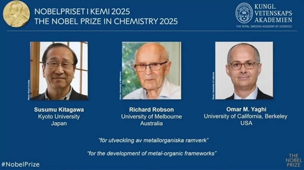 جایزه نوبل شیمی سال ۲۰۲۵ به «سوسومو کیتاگاوا» (Susumu Kitagawa) از ژاپن، «ریچارد رابسون» (Richard Robson) از بریتانیا و «عمر یاغی» (Omar M. Yaghi) از اردن اهدا شد. این دانشمندان یک معماری مولکولی کاملاً جدید به نام «چارچوبهای فلزی-آلی» (MOFs) توسعه دادهاند؛ با این ساختارهای اسفنجی و کریستالی میتوان «اتاقهایی» در مقیاس مولکولی ایجاد کرد که پتانسیل حل برخی از بزرگترین مسائل بشریت مانند برداشت آب از هوای بیابان و جذب کربن دیاکسید را دارند.
