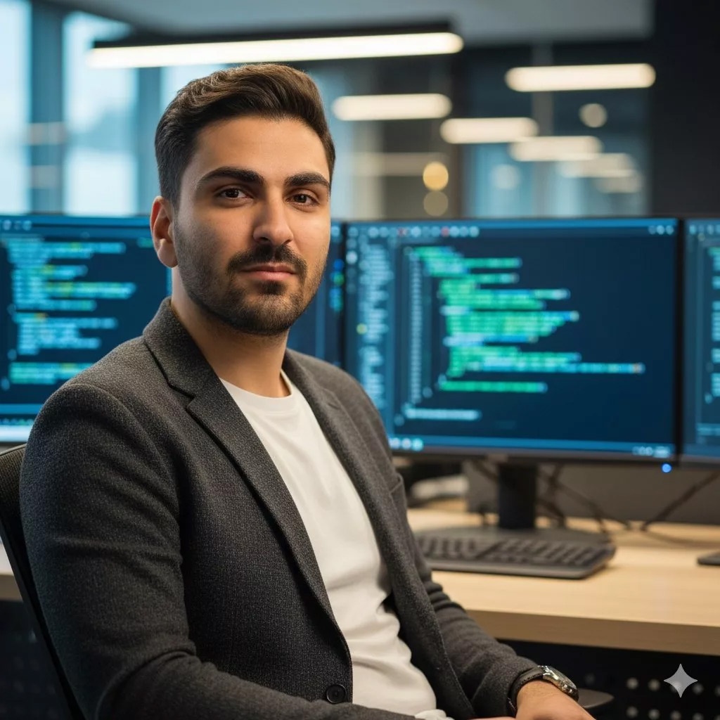 | همه شبکه های اجتماعی | این نوع تصاویر ترکیبی از محیط اداری مدرن و المانهای مرتبط با فناوری است. برای پروفایلهای برنامهنویسان، مدیران محصول و کارکنان استارتاپها بسیار کاربردی است. | Tech-focused professional portrait, person at a modern office desk, blurred monitors with code, smart casual outfit, cinematic soft lighting, 8K hyper-realistic portrait |  |