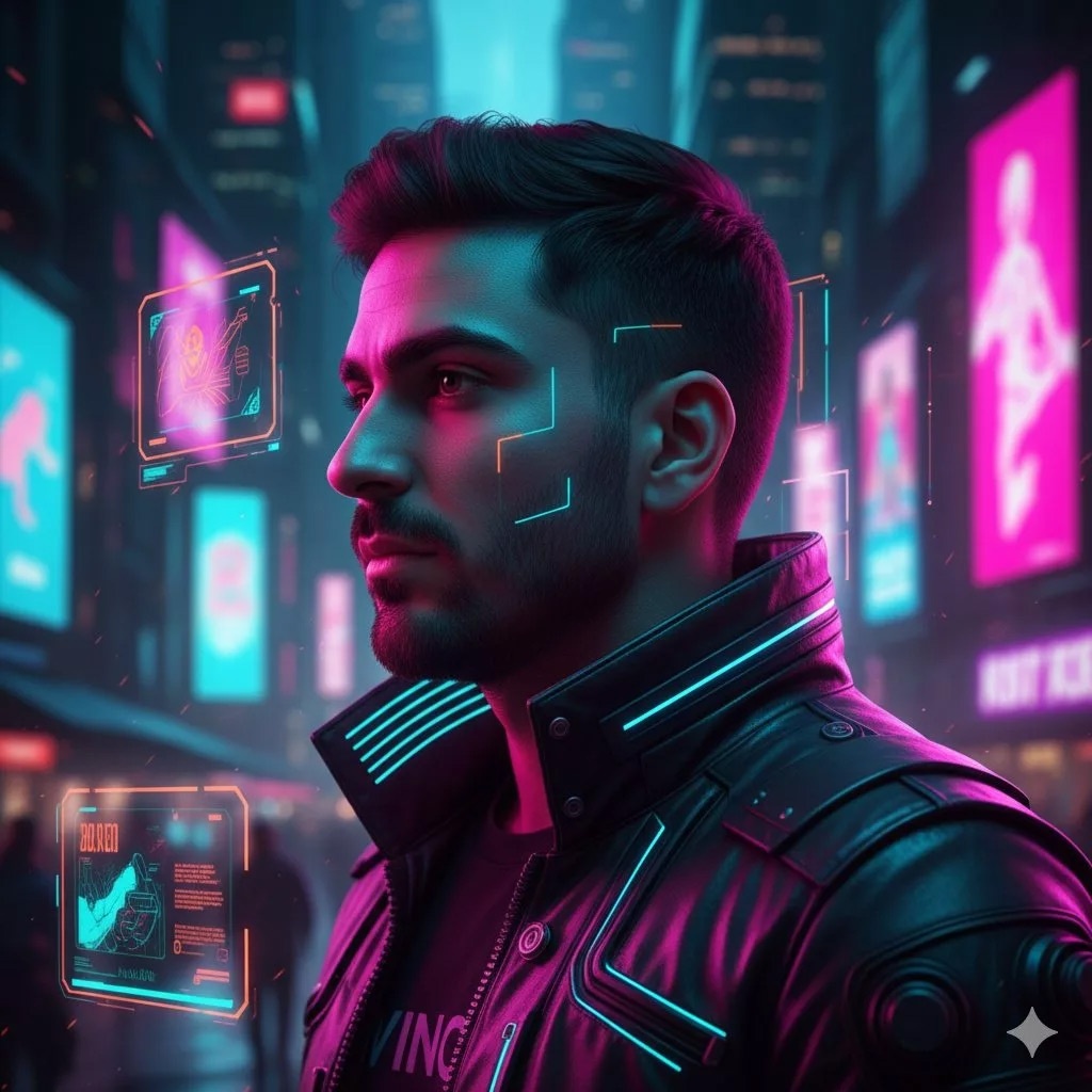 | گیمینگ یا سایبرپانک | تمرکز این بخش بر نورهای نئونی، جلوههای آیندهنگرانه و جزئیات تصویری پرانرژی است. این سبک برای کاربران گیمینگ، دیسکورد و پلتفرمهای مرتبط با فناوری مناسب است. | Cyberpunk gaming avatar for profile picture, neon reflections on the face, futuristic blurred city background, holographic HUD elements, hyper-realistic 8K, cinematic magenta and blue lighting, sci-fi jacket |  |