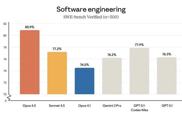 همچنین Opus 4.5 نخستین مدلی است که در بنچمارک معتبر SWE-Bench verified امتیاز بالای ۸۰ درصد کسب میکند.