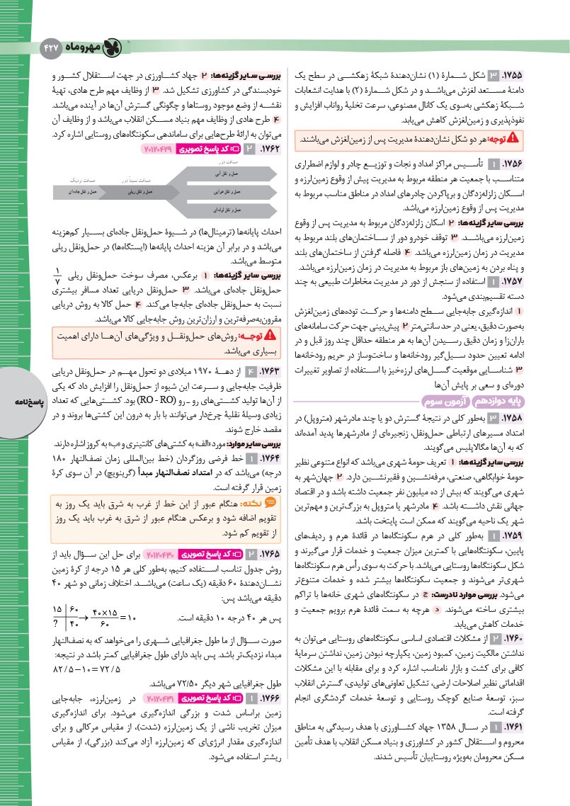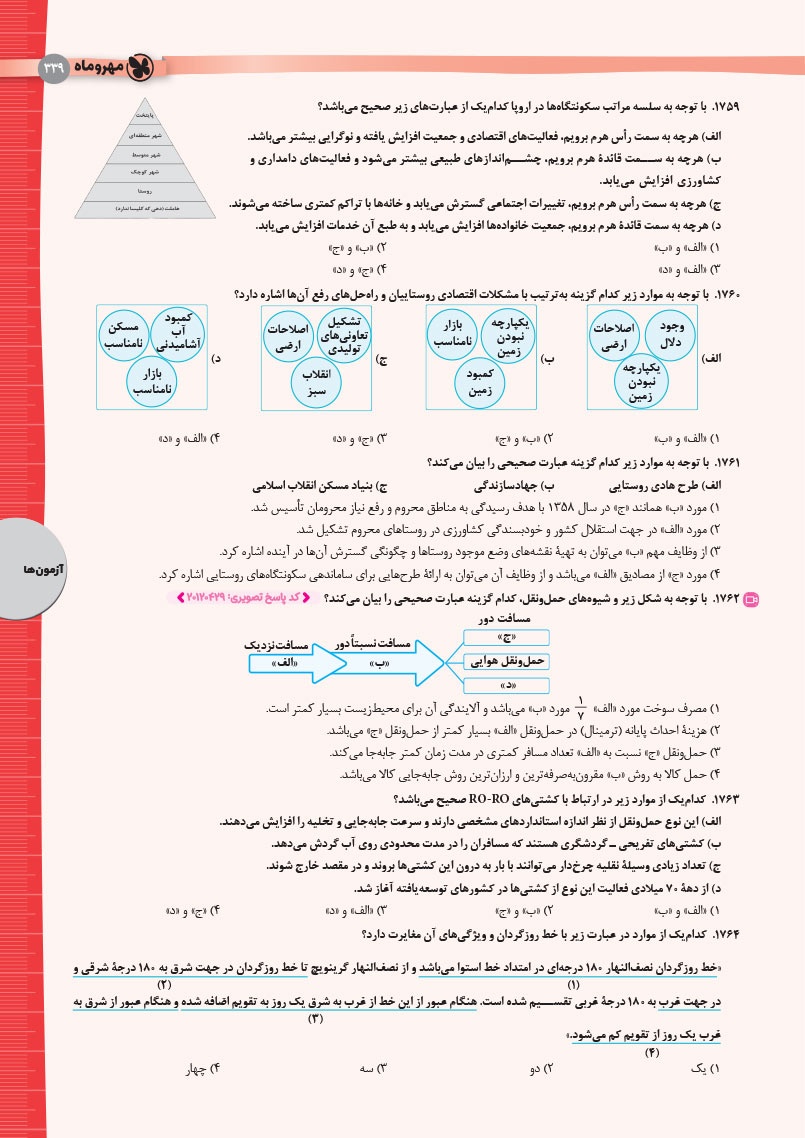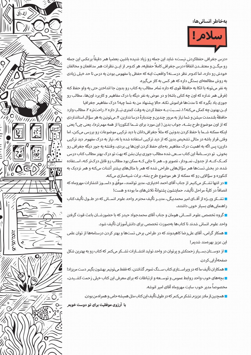- ارائۀ درسنامۀ کامل هر سه کتاب جغرافیا - بیان تمام نکات کتاب درسی در قالب نمودارها و جدولهای مقایسهای و موضوعی - دستهبندی فوقالعادۀ مطالب درسی برای تثبیت موارد آموزشی - ارائۀ بیش از 1۸00 تست استاندارد ( تالیفی-کنکور ) - شبیهسازی سؤالات تألیفی بر اساس کنکور سالهای گذشته - پاسخنامۀ کاملاً تشریحی با بررسی کامل گزینهها - به همراه فلشکارت آموزشی، برای مرور و جمعبندی درسها - 14 دوره آزمون استاندارد مطابق رویکرد جدید کنکور - به همراه سؤالات کنکور امسال