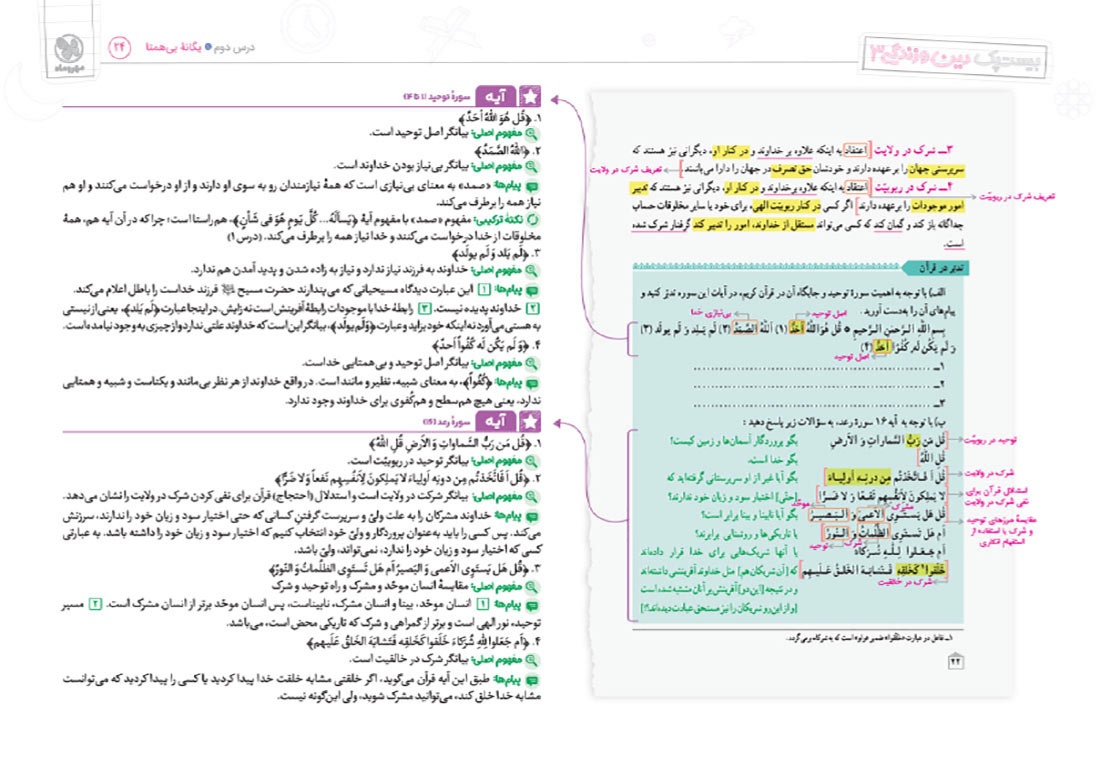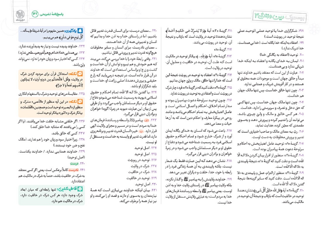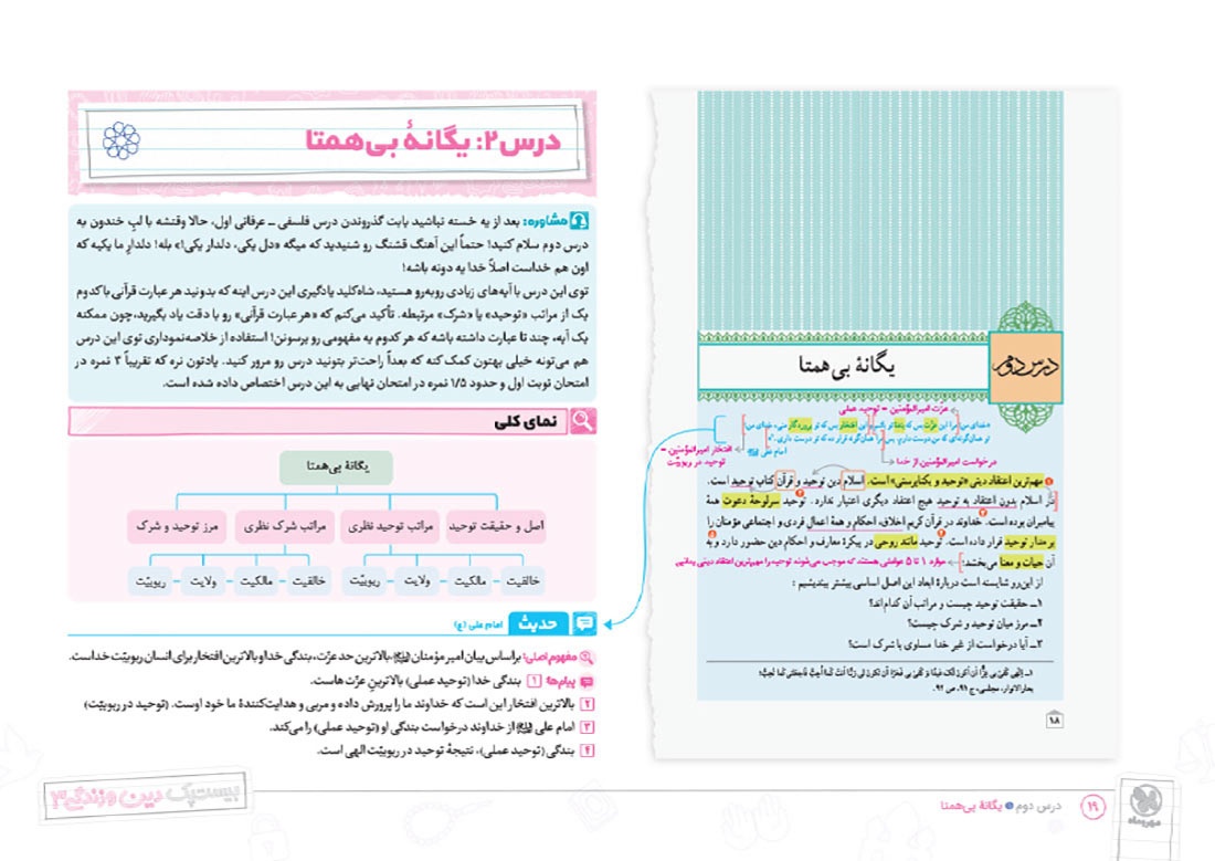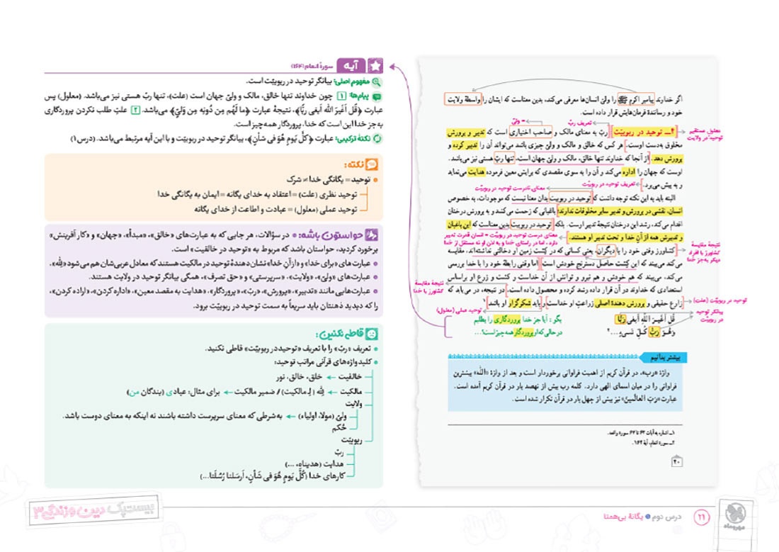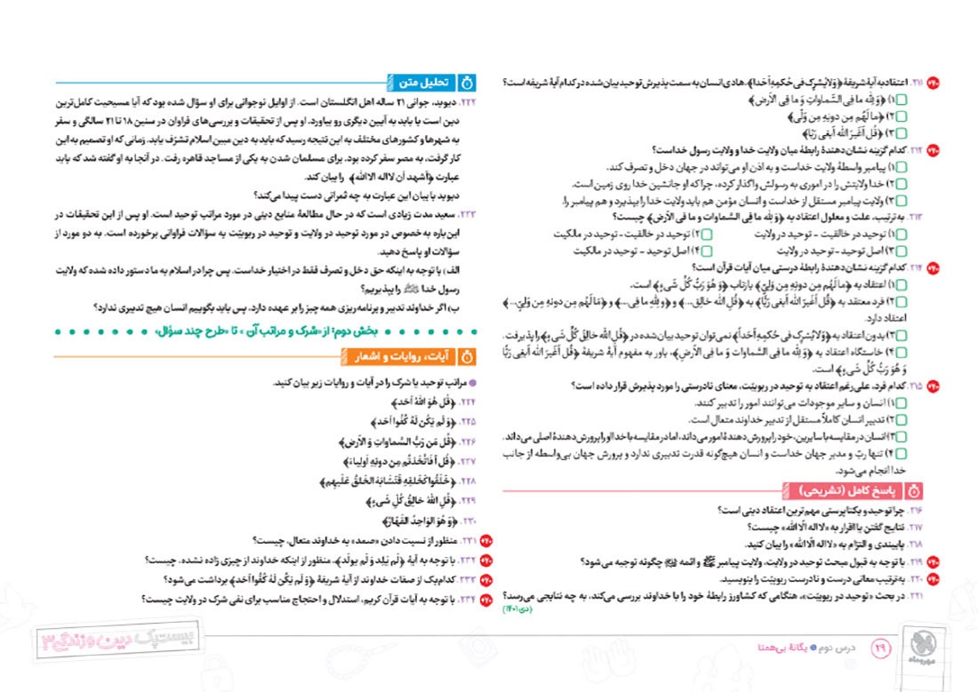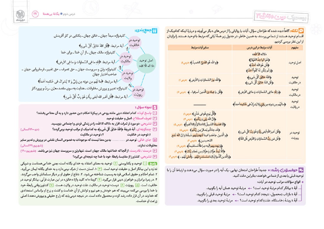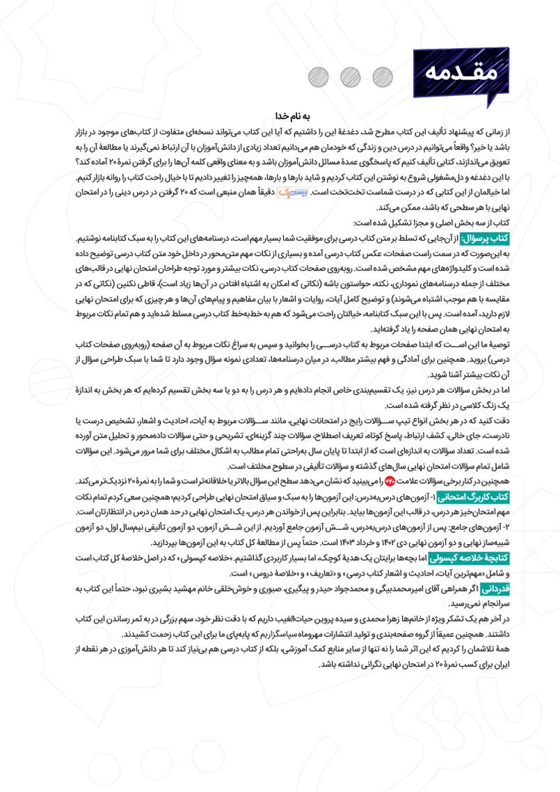 - پوشش نکات تمامی آیات، احادیث و اشعار کتاب درسی