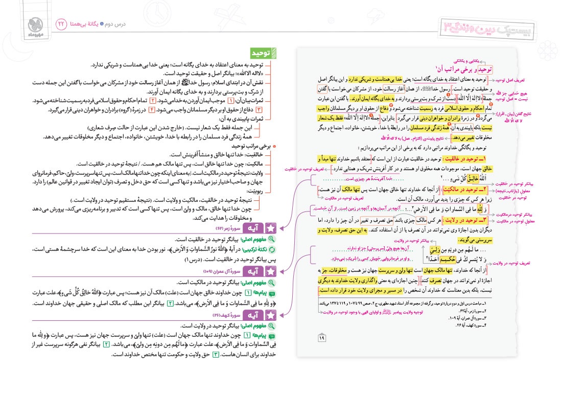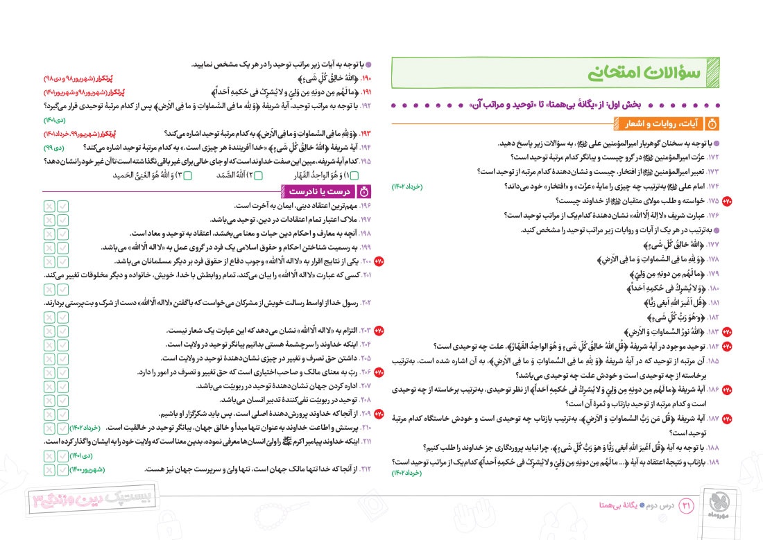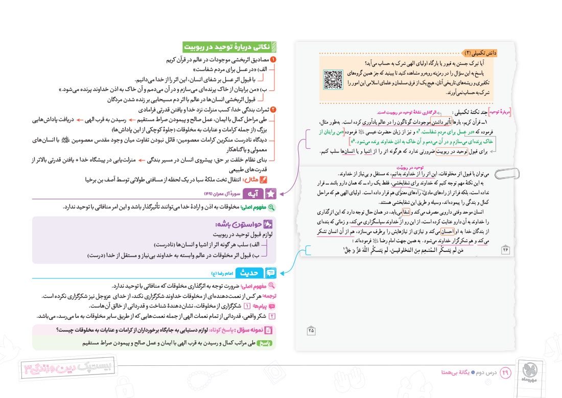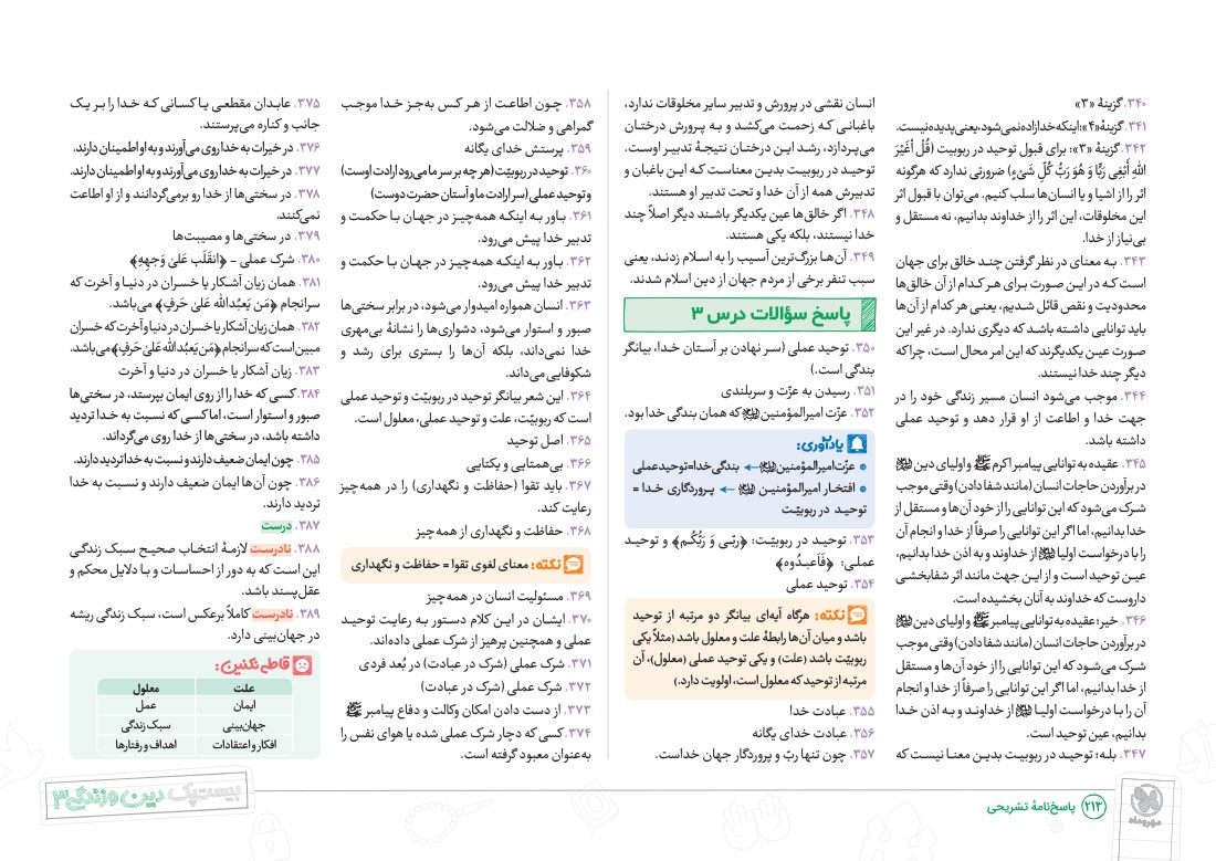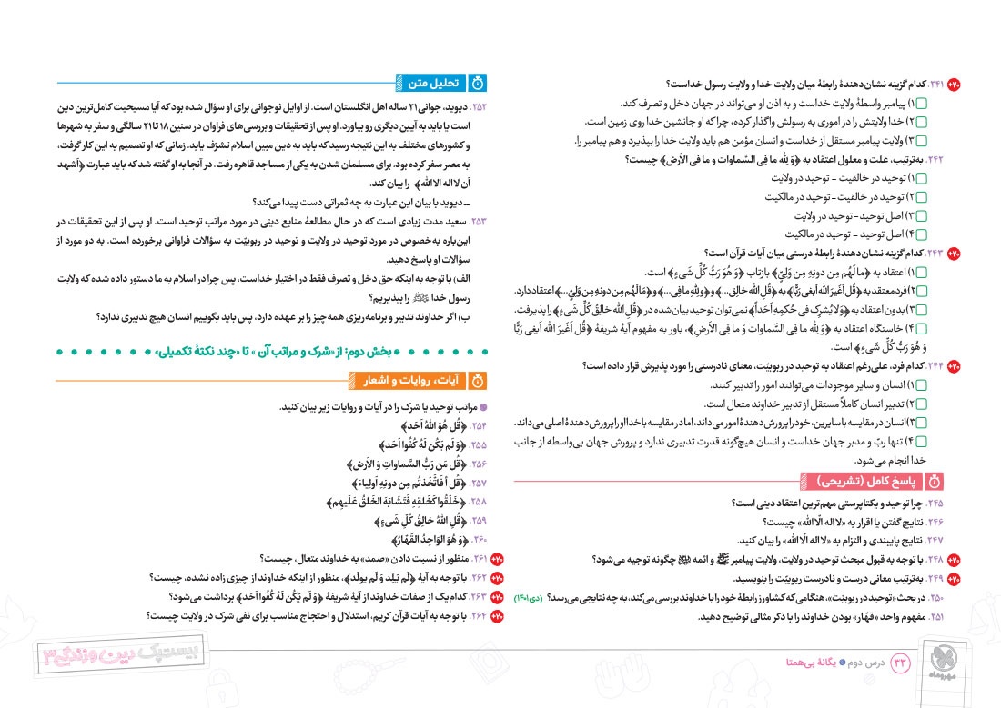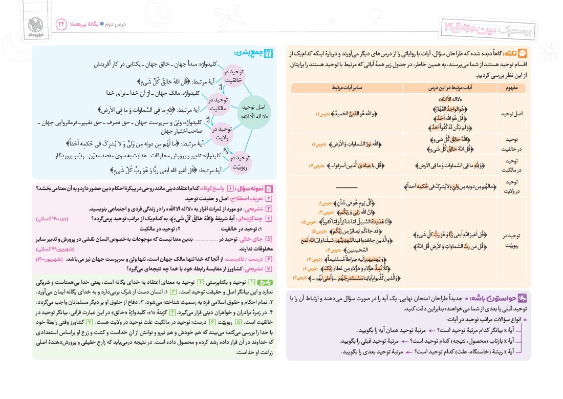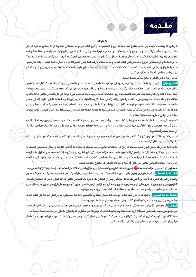 - پوشش نکات تمامی آیات، احادیث و اشعار کتاب درسی