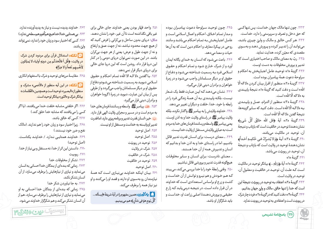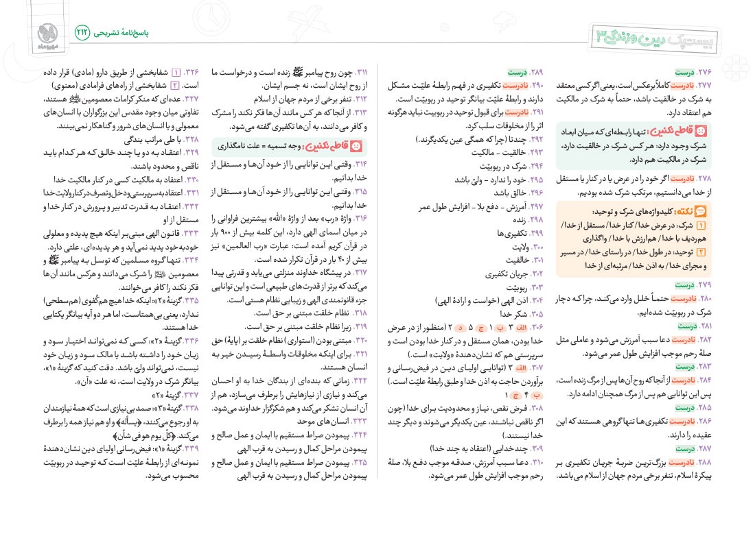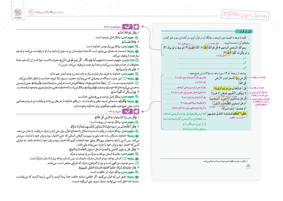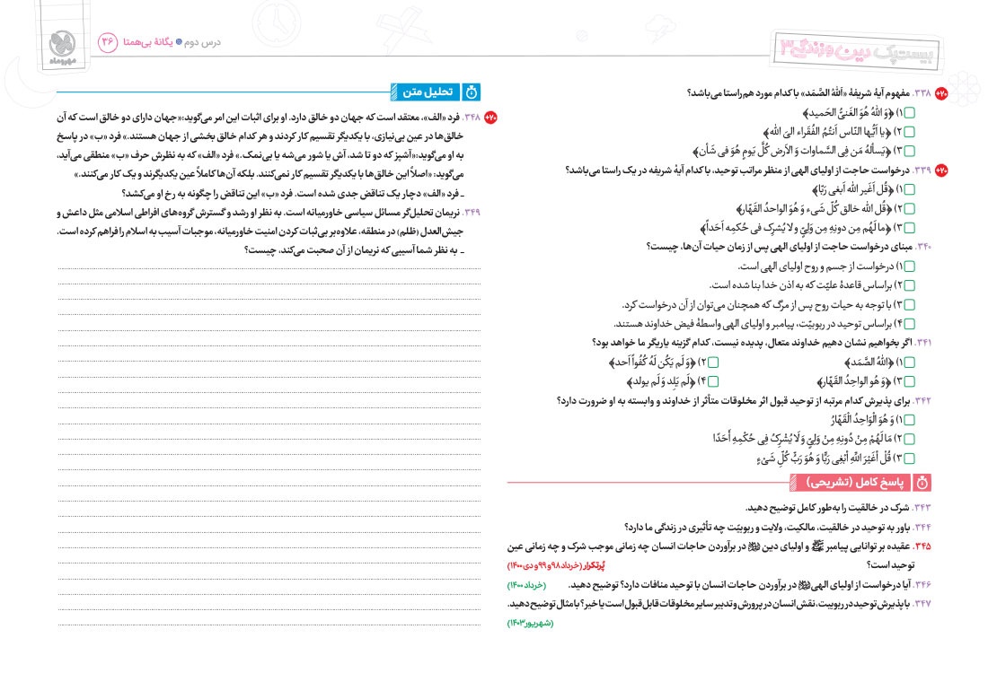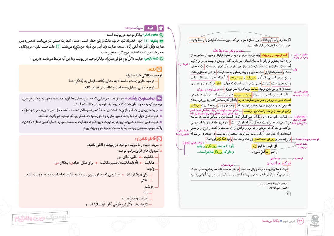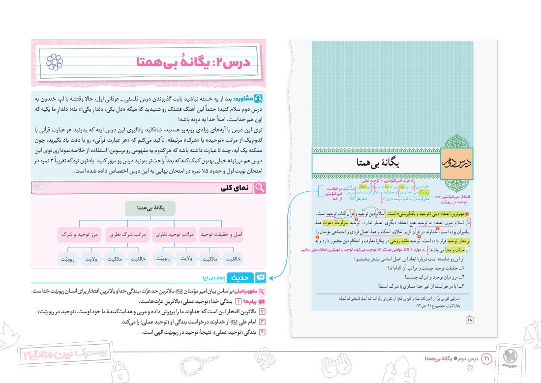 - پوشش نکات تمامی آیات، احادیث و اشعار کتاب درسی