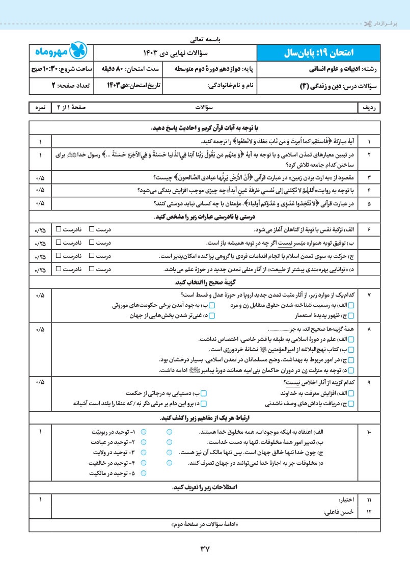 سوالات امتحان های این بسته، براساس آخرین رویکردهای امتحانات نهایی و کاملا مشابه برگه های امتحانی و با رعایت جدیدترین بارم بندی طراحی شده است