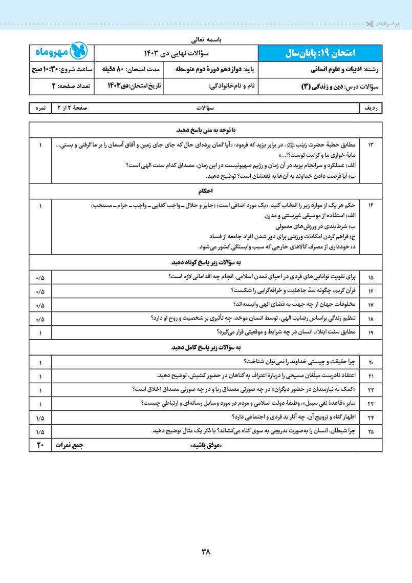 - 20 کاربرگ امتحانی