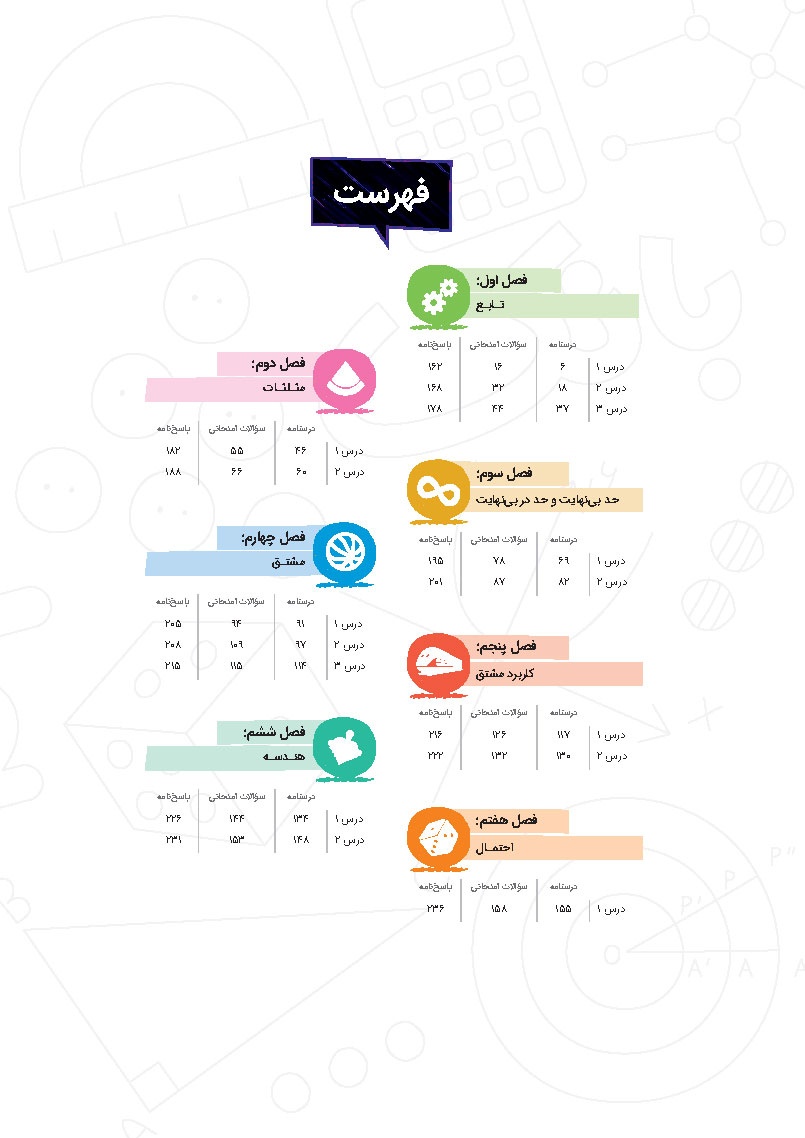 امتحان های این بسته، براساس آخرین رویکردهای طراحان در امتحانات نهایی و با رعایت جدیدترین بارم بندی اعلام شده توسط دفتر برنامه ریزی و تالیف آموزش و پرورش طراحی شده است