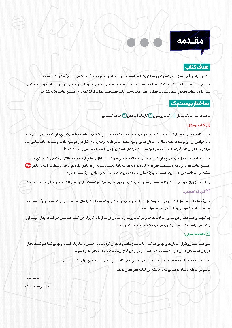 بنابراین پیشنهاد میکنیم پس از مطالعه هر فصل از کتاب پرسوال، امتحان همان فصل را جدا کنید و در شرایط مشابه حوزه امتحانی خودتان را محک بزنید بعد از امتحان نیز با توجه به بارم بندی هر سوال در پاسخ نامه، برگه خود را تصحیح و تحلیل کنید.