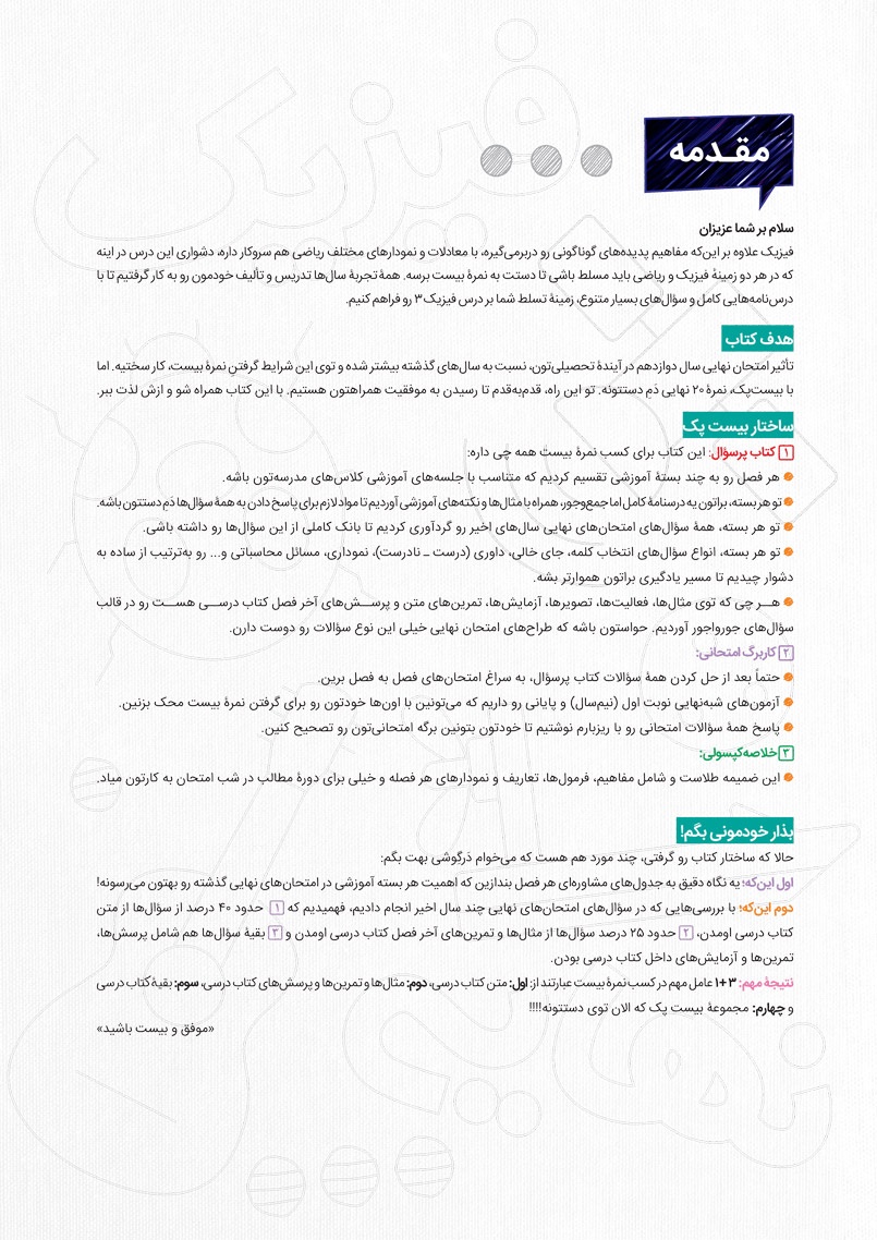 بنابراین پیشنهاد میکنیم پس از مطالعه هر فصل از کتاب پرسوال، امتحان همان فصل را جدا کنید و در شرایط مشابه حوزه امتحانی خودتان را محک بزنید بعد از امتحان نیز با توجه به بارم بندی هر سوال در پاسخ نامه، برگه خود را تصحیح و تحلیل کنید.