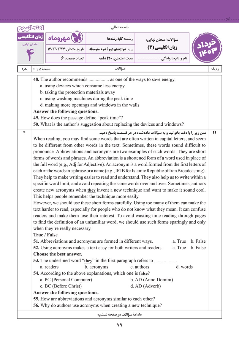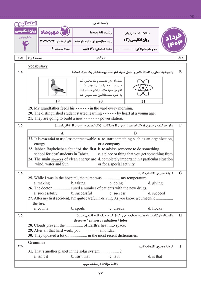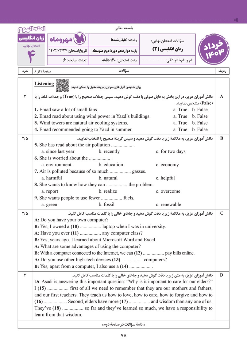 نهایی های خرداد ماهبرای آشنایی هرچه بیشتر شما با سوالات امتحانات نهایی، برای هر درس دو امتحان نهایی برگزار شده در خرداد ماه را بدون هیچ تغییری قرار داده ایم.