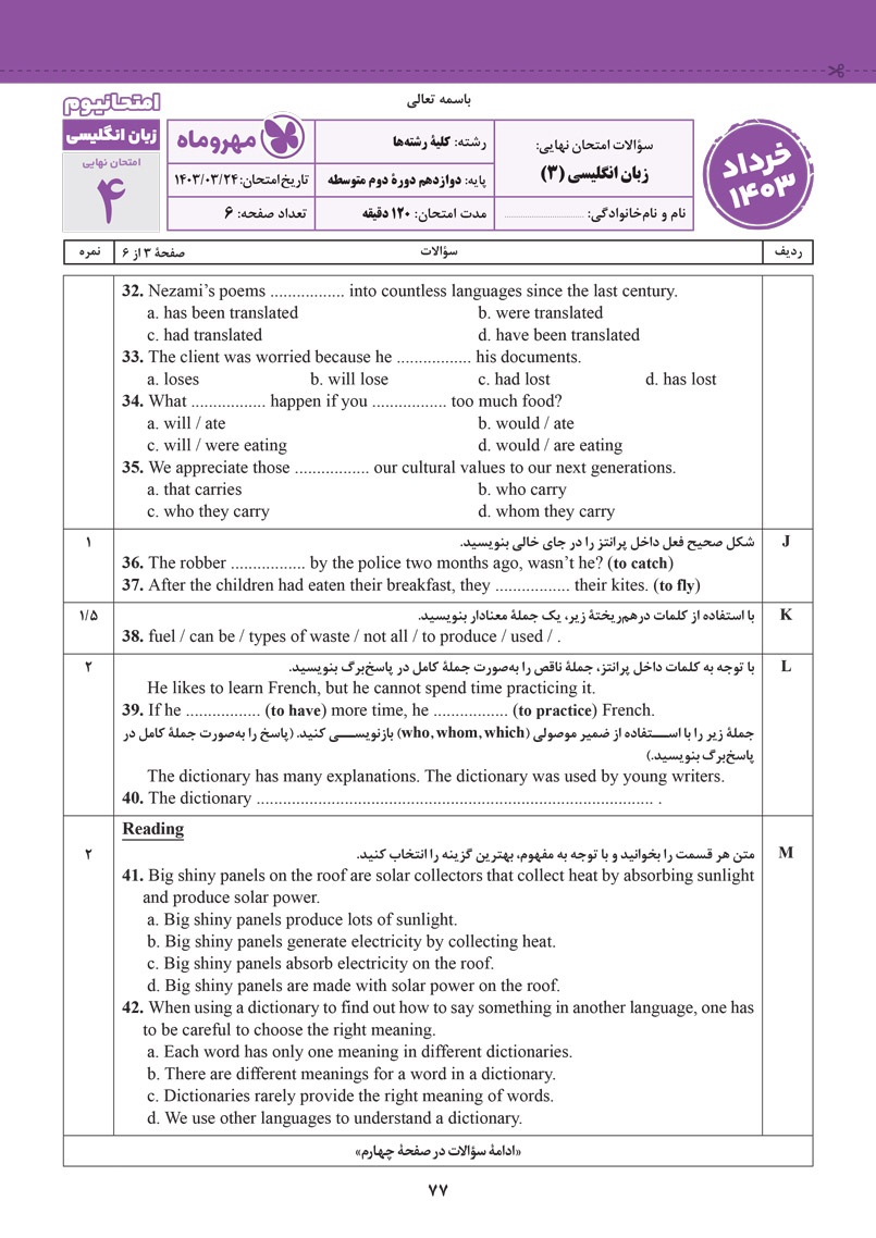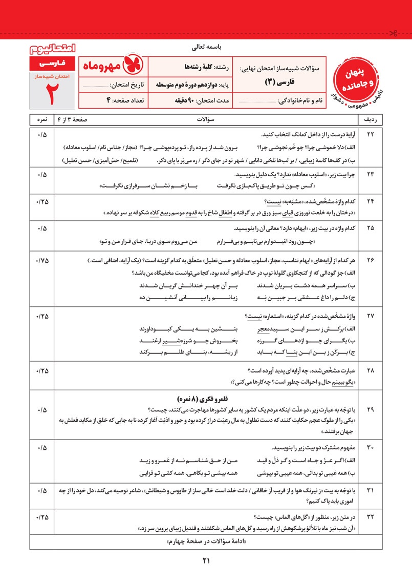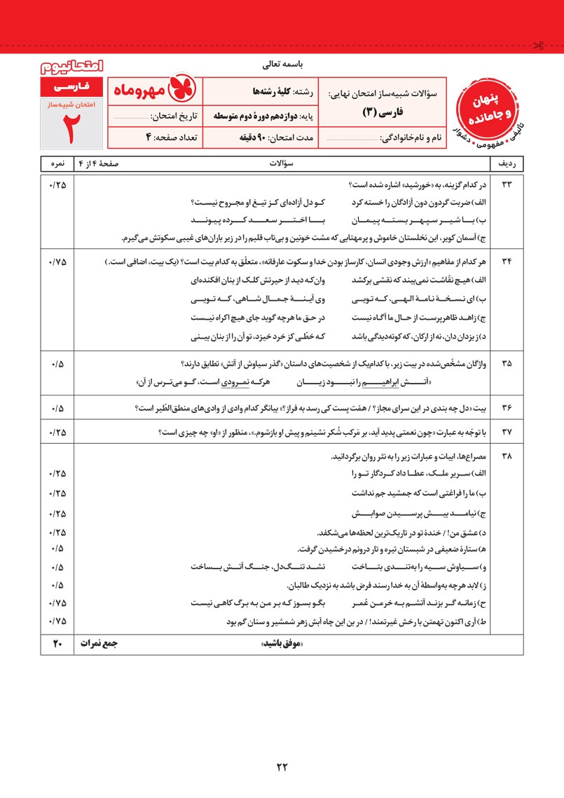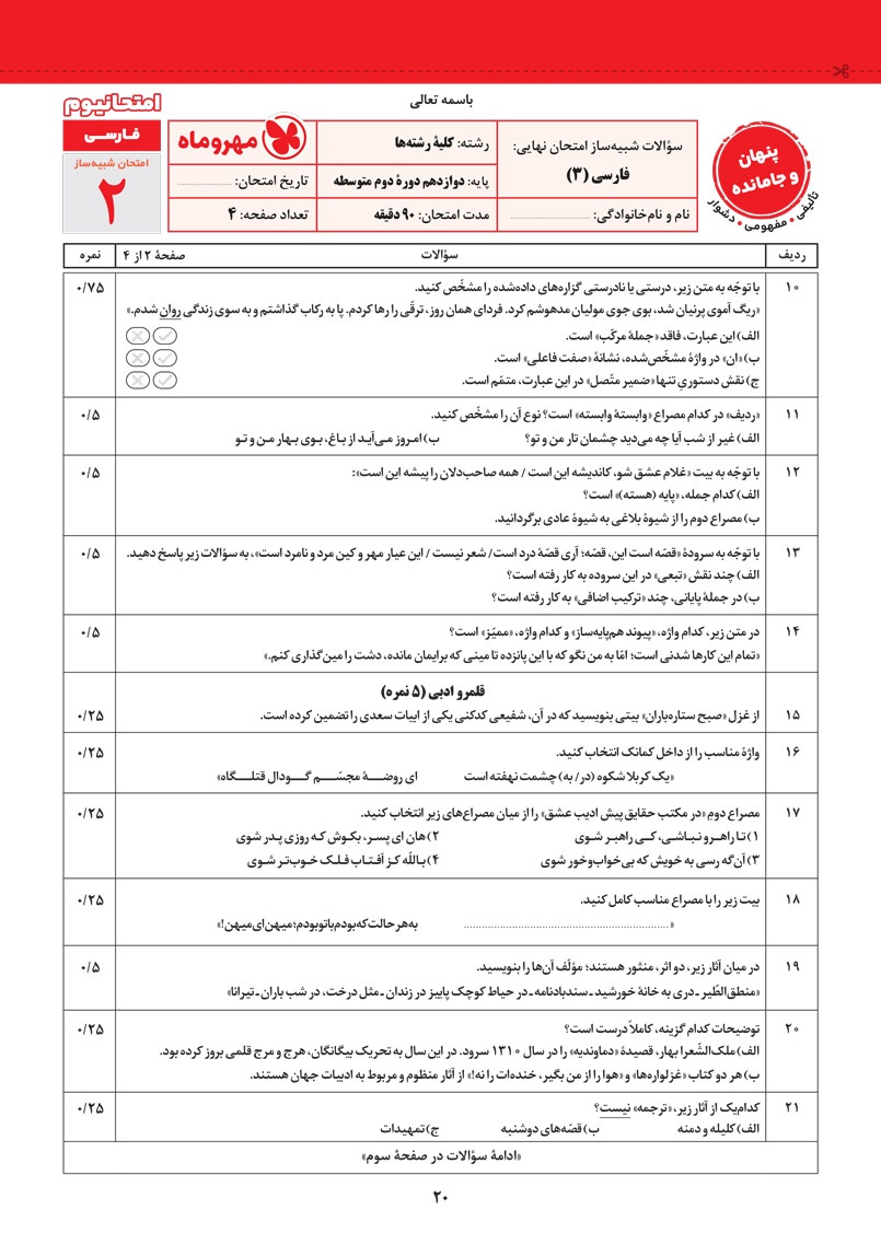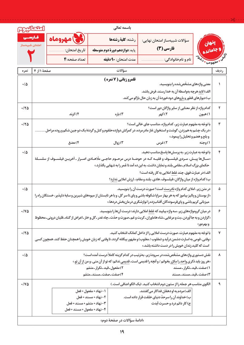 پنهان و جاماندهسوالات این امتحان ، از مباحثی تالیف شده است که کمتر در امتحانات نهایی مورد پرسش قرار گرفته اند ، اما اهمیت سنجش بالایی دارند. با پاسخگویی به این سوالات ، دیگر سر جلسه ی امتحان نهایی ، غافلگیر نخواهید شد.