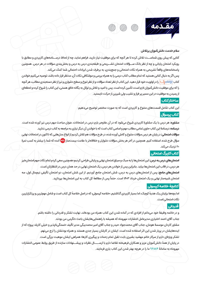 بنابراین پیشنهاد میکنیم پس از مطالعه هر درس از کتاب پرسوال، امتحان همان درس را جدا کنید و در شرایط مشابه نهایی از خودتان امتحان بگیرید و سپس با توجه به بارم بندی هر سوال در پاسخ نامه، برگه خود را تصحیح و تحلیل کنید.