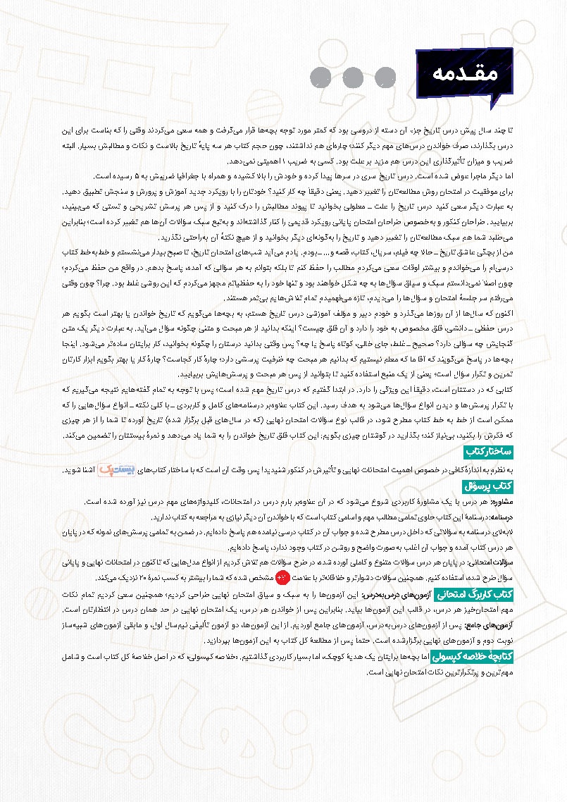 بنابراین پیشنهاد میکنیم پس از مطالعه هر درس از کتاب پرسوال، امتحان همان درس ها را جدا کنید و در شرایط مشابه نهایی از خودتان امتحان بگیرید و سپس با توجه به بارم بندی هر سوال در پاسخ نامه، برگه خود را تصحیح و تحلیل کنید.