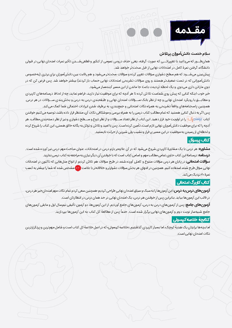 بنابراین پیشنهاد میکنیم پس از مطالعه هر درس از کتاب پرسوال، امتحان همان درس را جدا کنید و در شرایط مشابه نهایی از خودتان امتحان بگیرید و سپس با توجه به بارم بندی هر سوال در پاسخ نامه، برگه خود را تصحیح و تحلیل کنید.