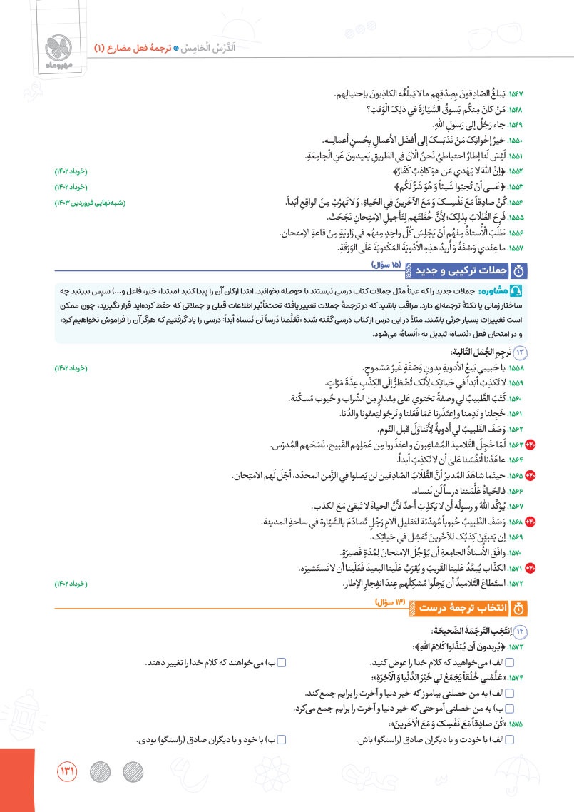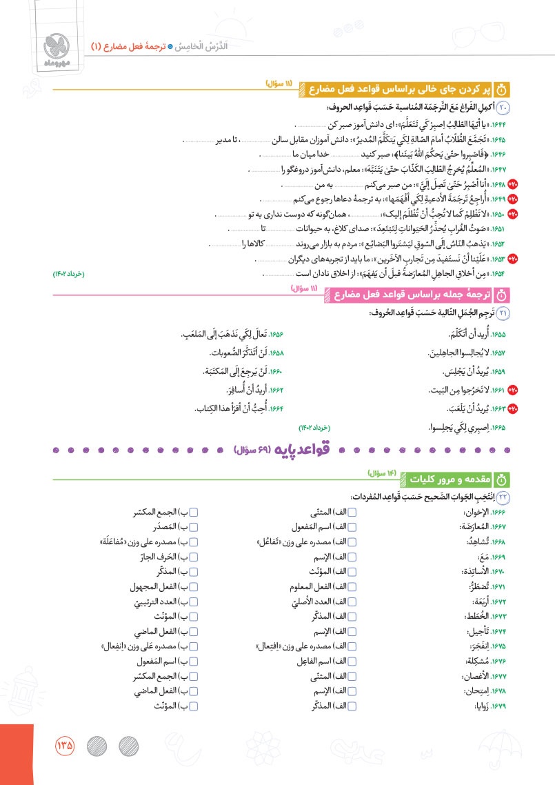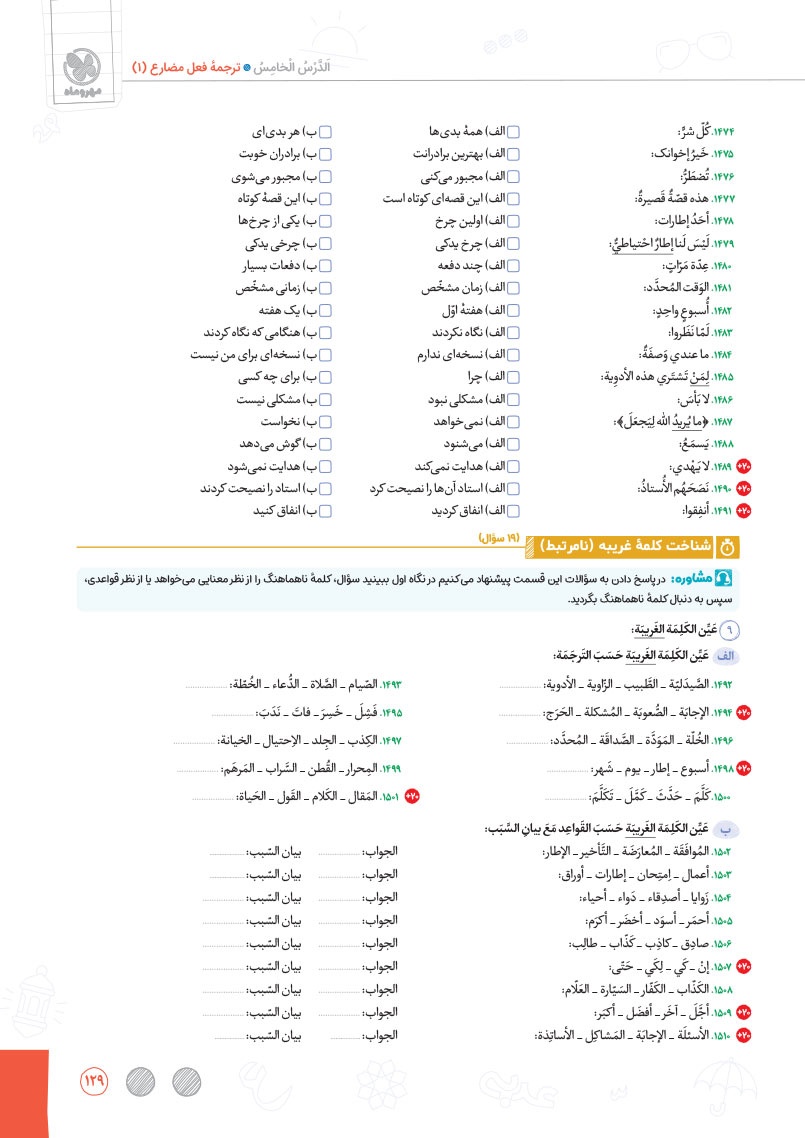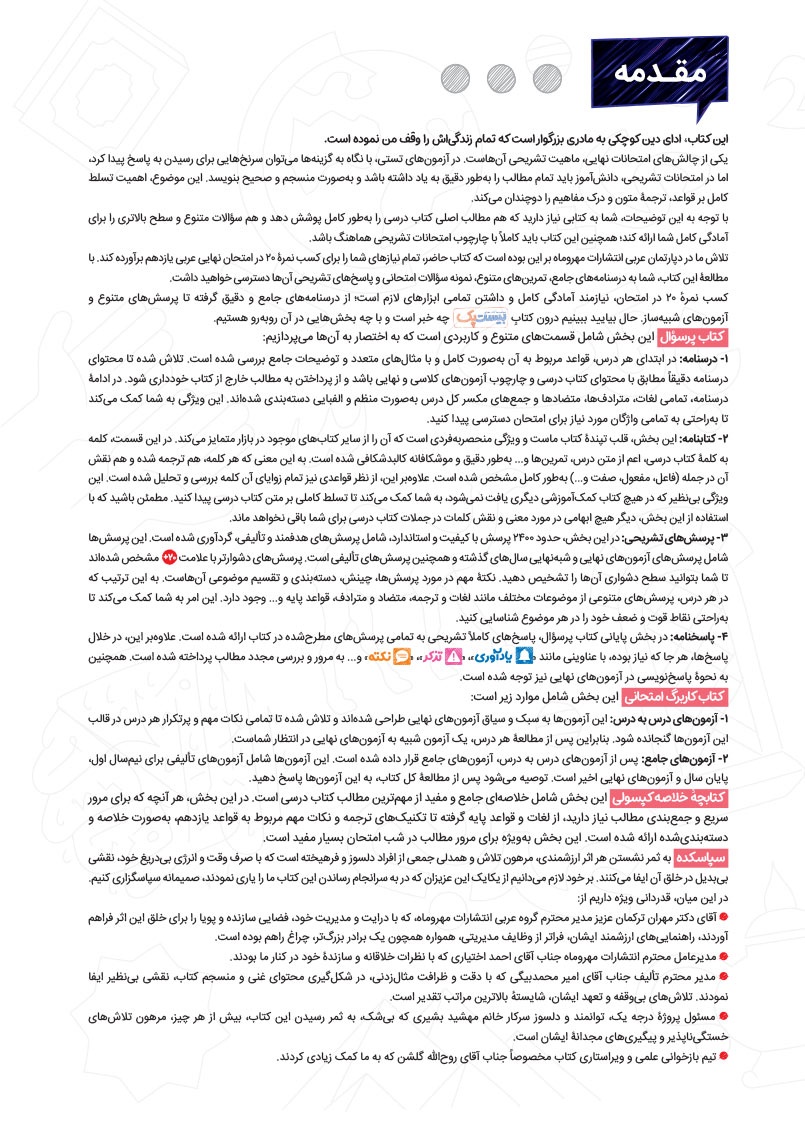 - طبقهبندی دقیق و نوآورانه سوالات به صورت درس به درس و سطر به سطر در موضوعات واژگان، ترجمهی درک مطلب، قواعد و تحلیل صرفی