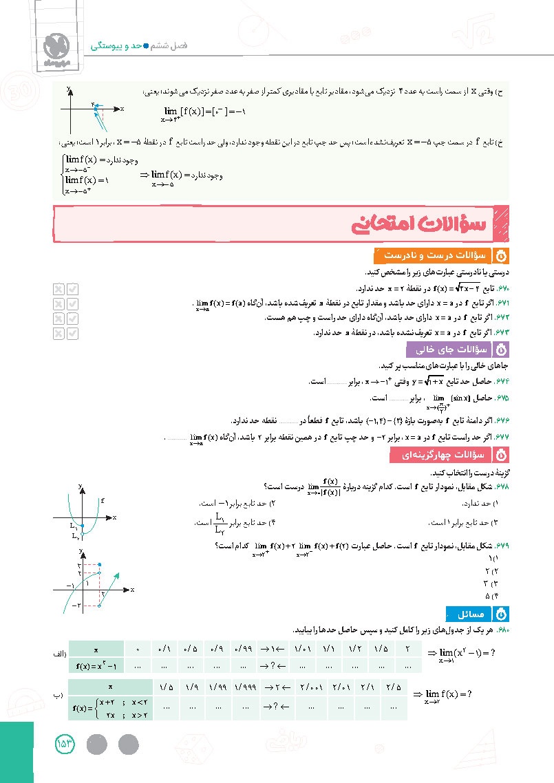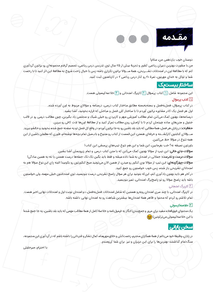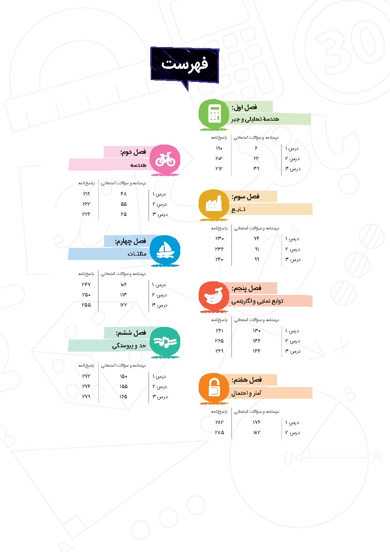 بنابراین پیشنهاد میکنیم پس از مطالعه هر فصل از کتاب پرسوال، امتحان همان فصل را جدا کنید و در شرایط مشابه حوزه امتحانی خودتان را محک بزنید بعد از امتحان نیز با توجه به بارم بندی هر سوال در پاسخ نامه، برگه خود را تصحیح و تحلیل کنید.
