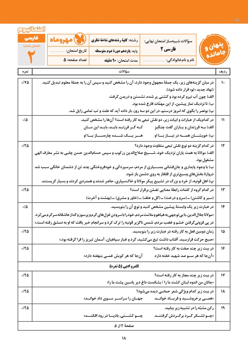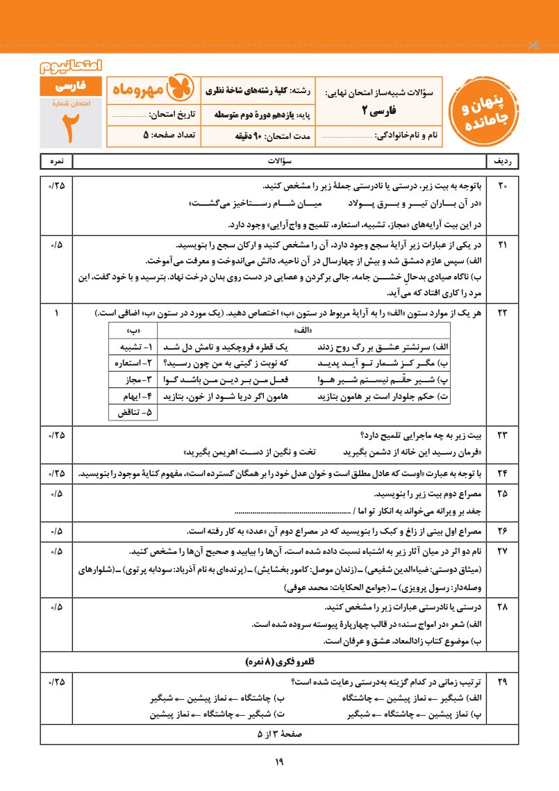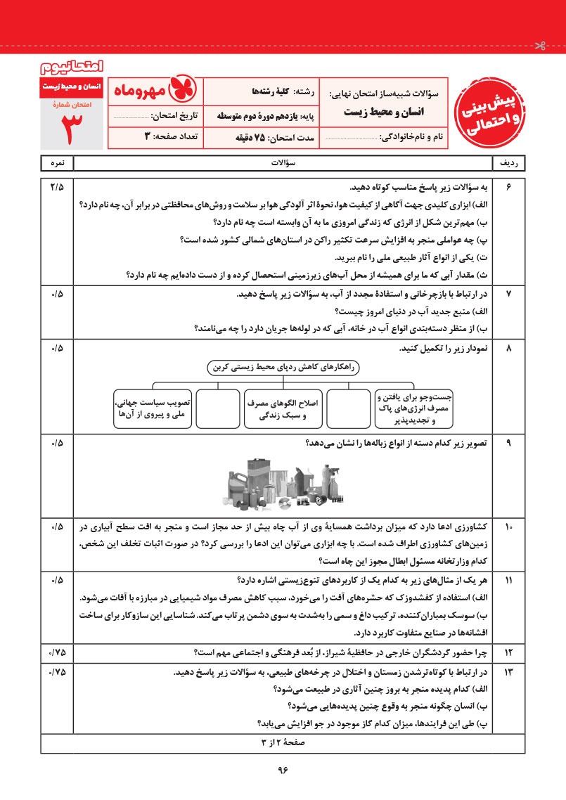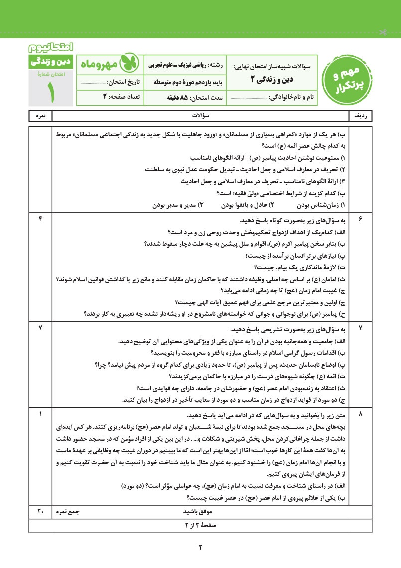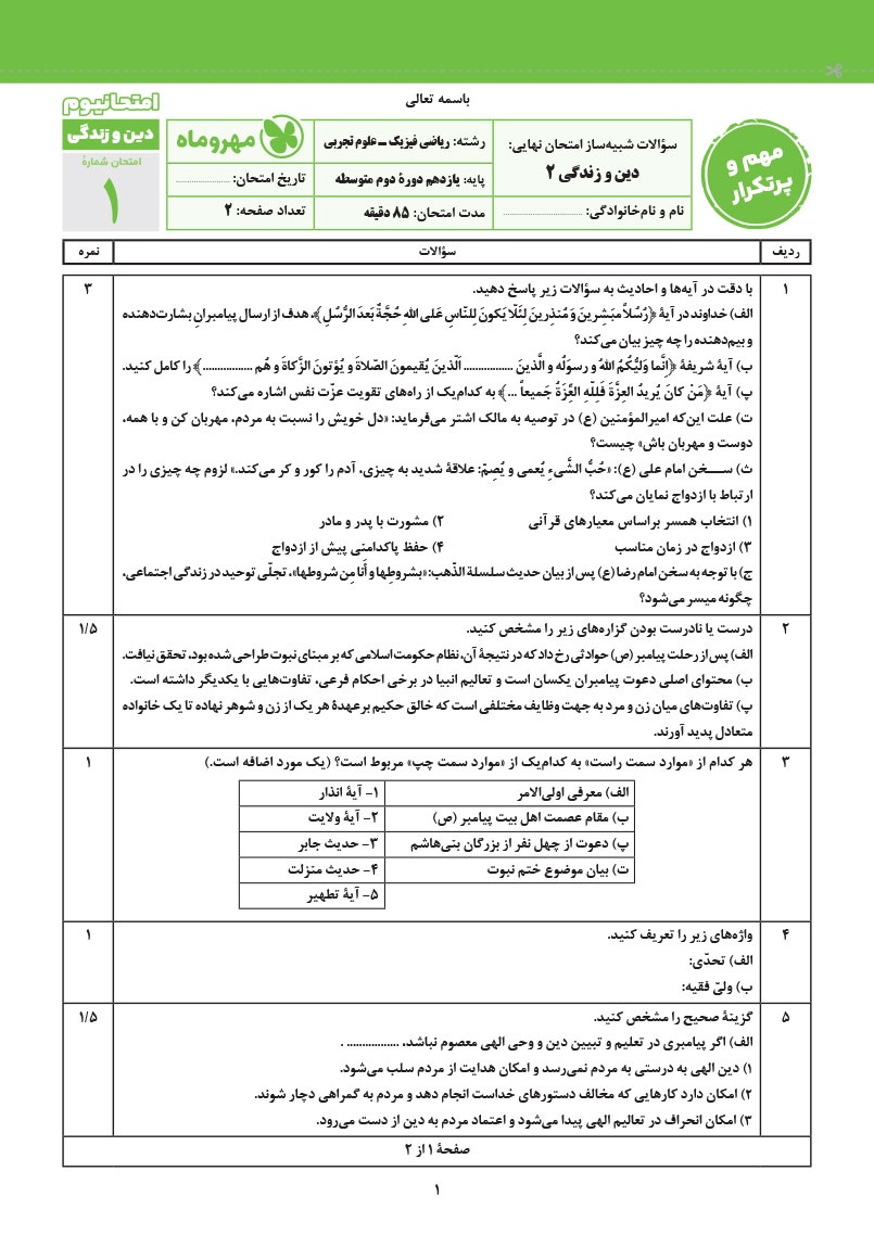 برای آشنایی هرچه بیشتر شما با سوالات امتحانات نهایی، برای هر درس دو امتحان نهایی برگزار شده در خرداد ماه را بدون هیچ تغییری قرار داده ایم.